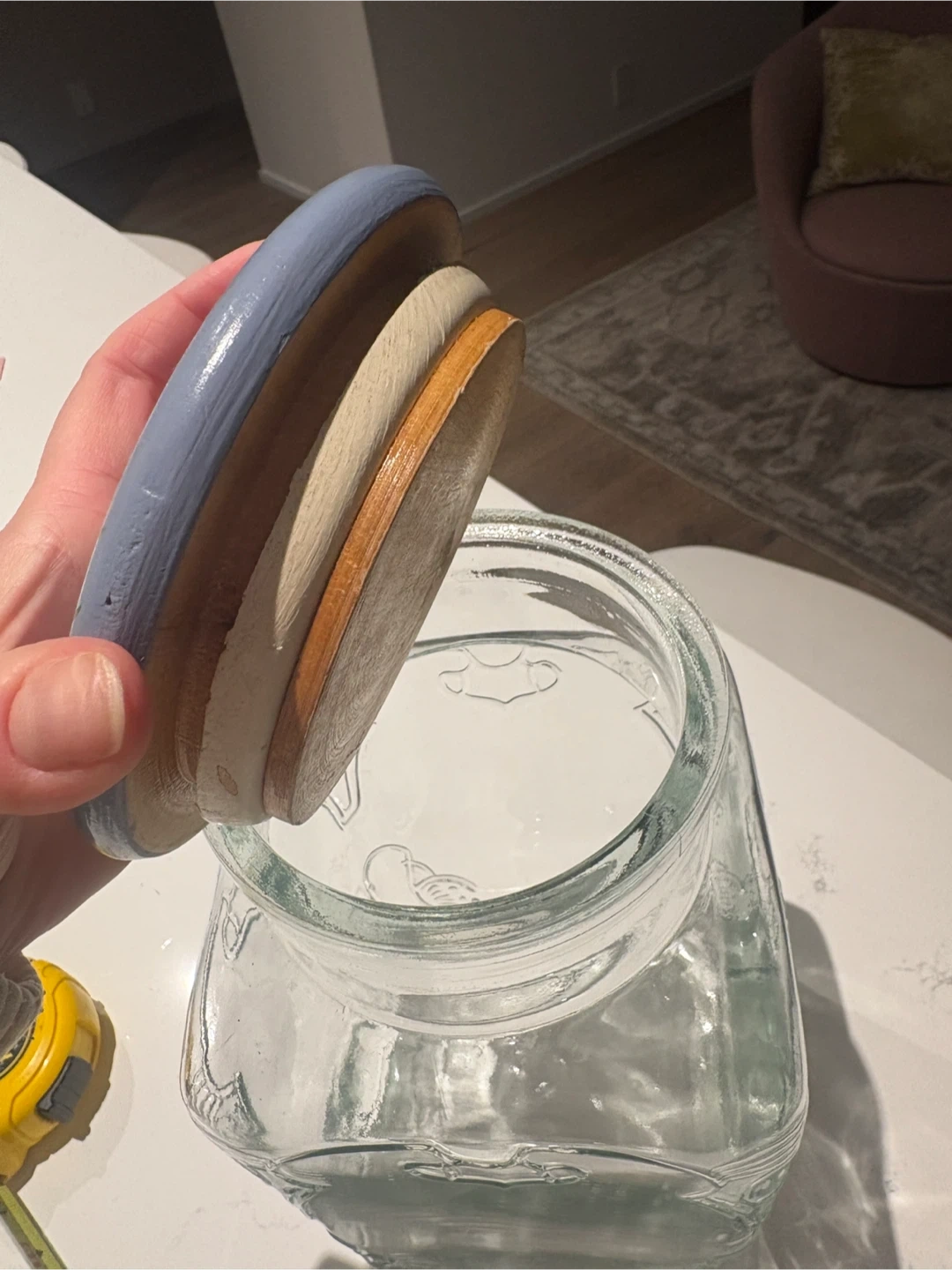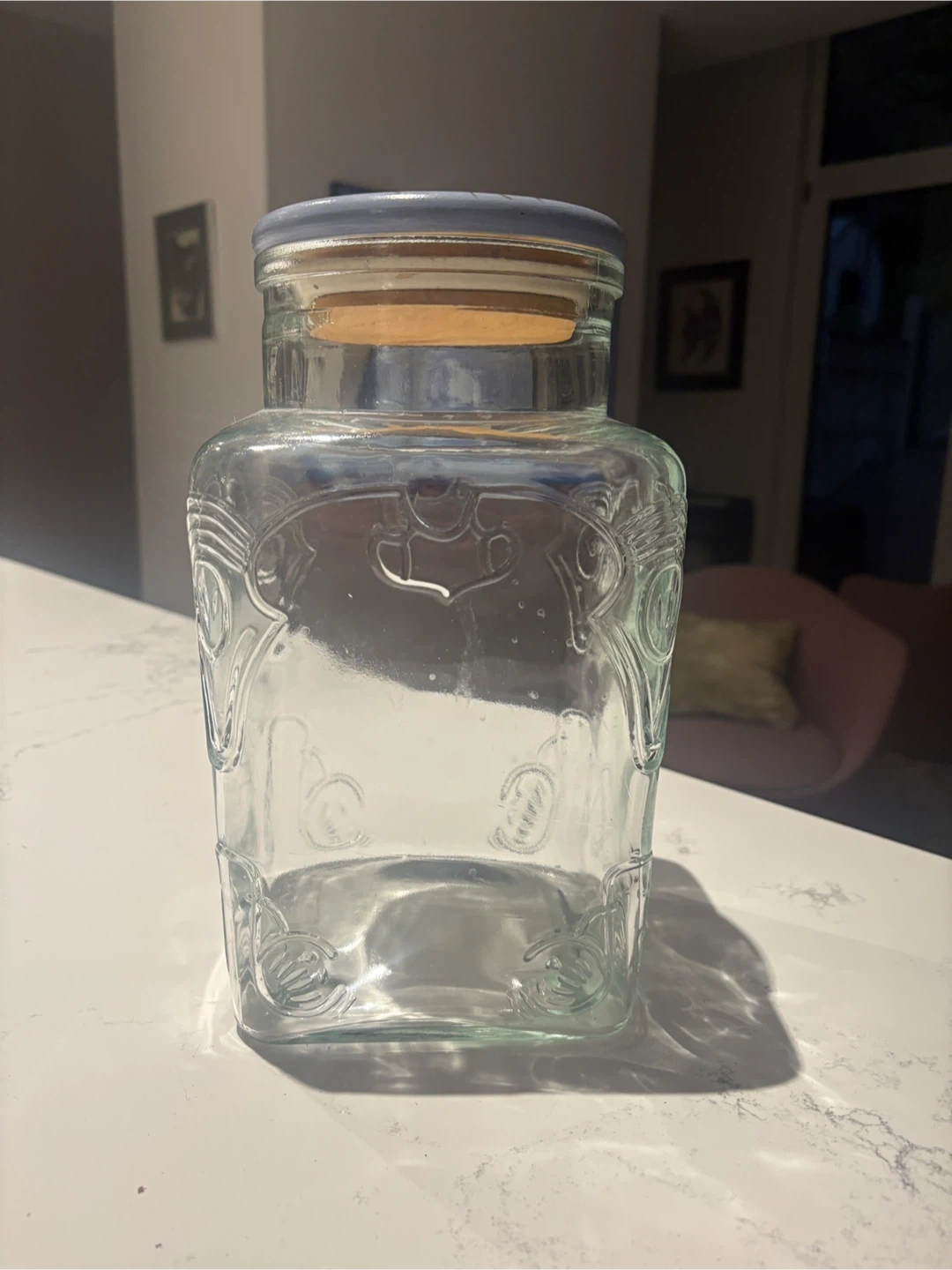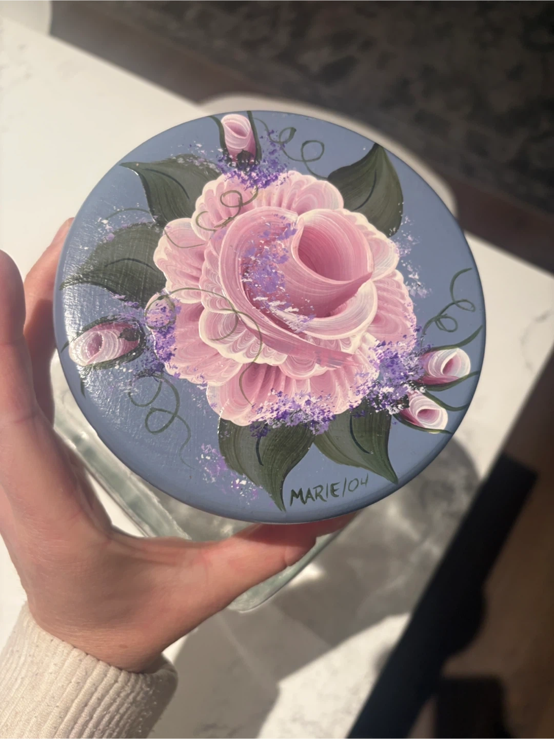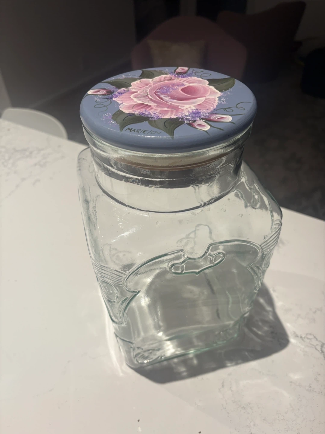 Large glass jar with a pretty painted lid. Pick up in the Beaches at Queen and Victoria Park.