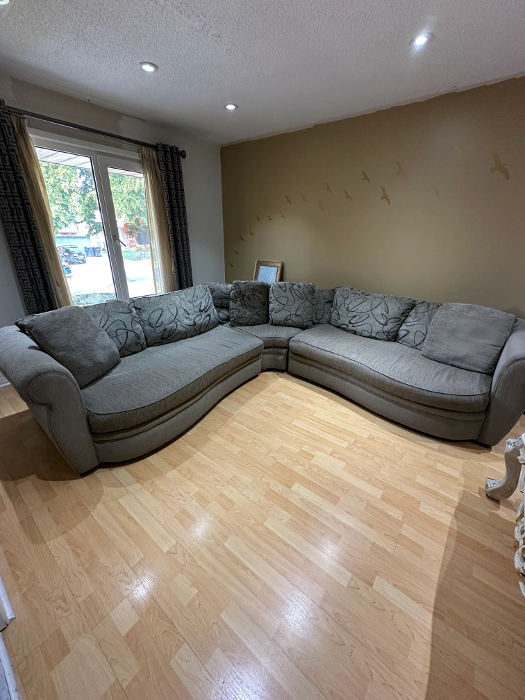 Selling a large sectional sofa in a neutral grey colour. It's in good condition and would be perfect for a family room or large living space. It features a patterned design on the cushions.