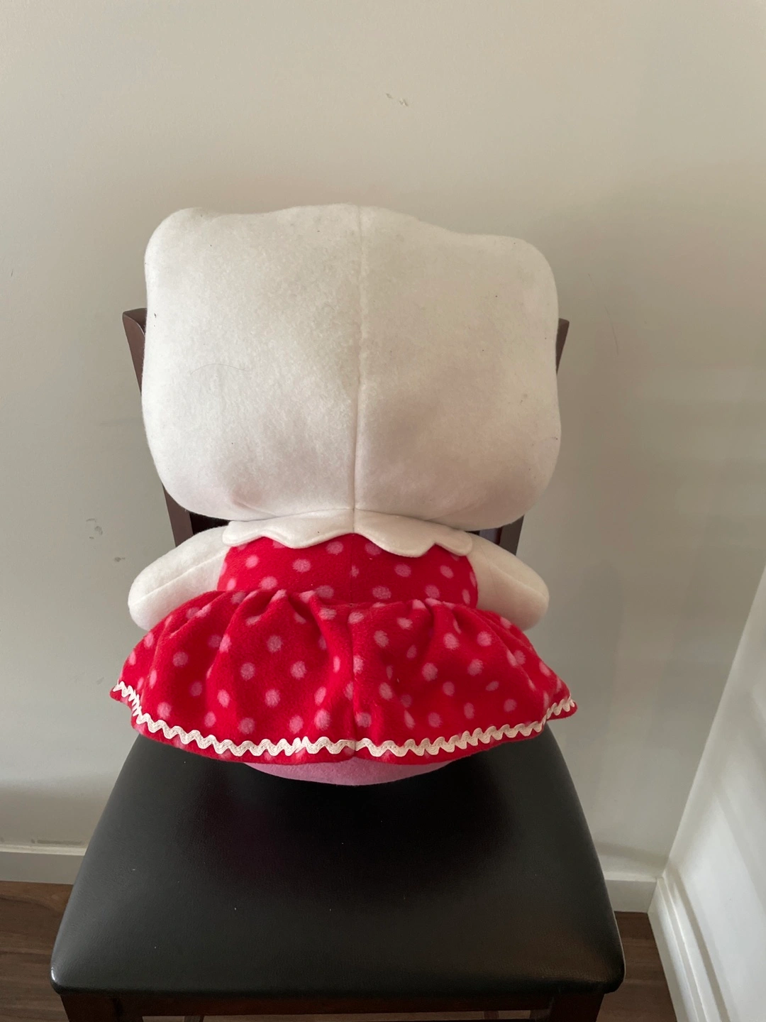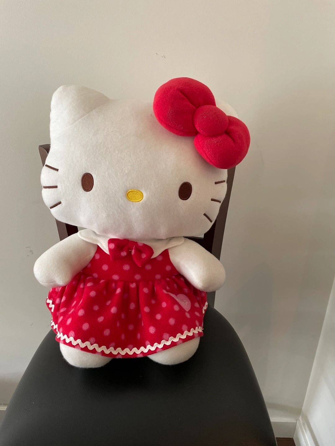Adorable Hello Kitty plush. Soft, white fur. Wears a red polka dot dress. Big red bow. Great for collectors or kids.