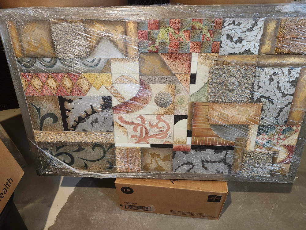 Large framed wall art. Features a collage of various patterns and textures. Mostly muted tones of beige, brown, grey, and red. Wrapped in plastic.