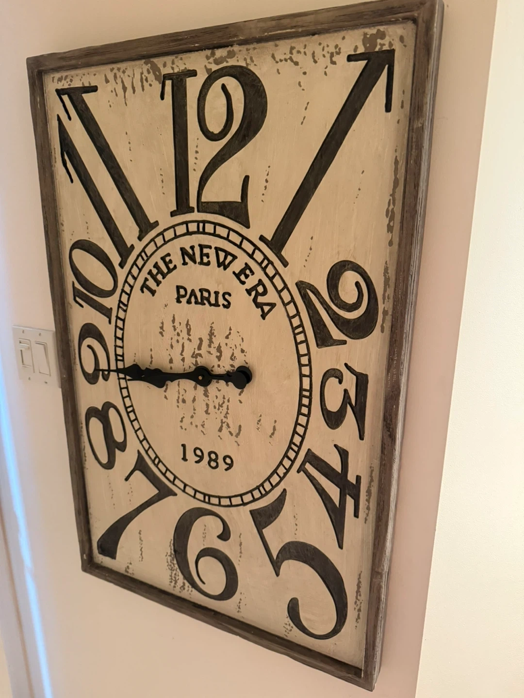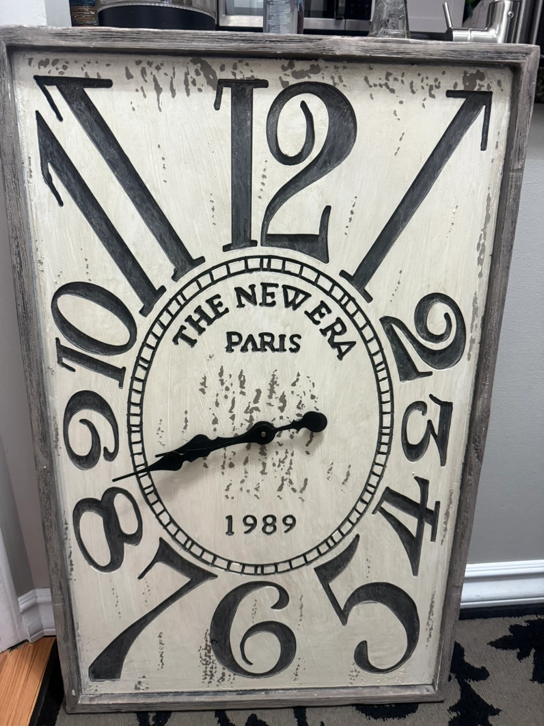 80Add a touch of Parisian charm to your home with this The New Era Paris wall clock! It features a vintage-inspired design with bold numbers and a distressed finish. The clock measures approximately 36.5" in length and 23.5" in width, with a 2" thickness.