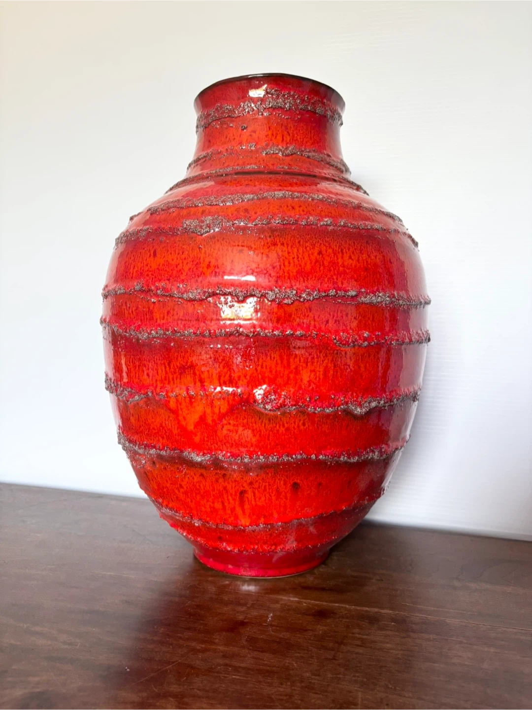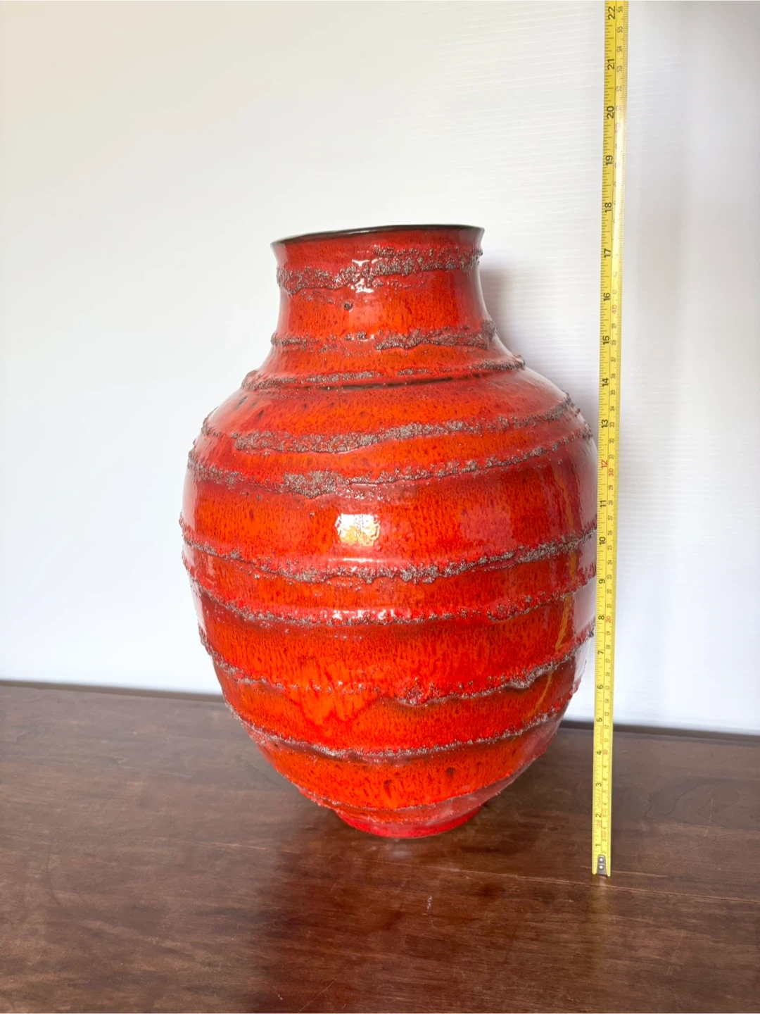 139A Vintage large mcm west German floor lava vase. Gorgeous colours and shape. Some small chips in the finish. Measures roughly 18” tall. Can still see the 46cm indicator on the bottom.