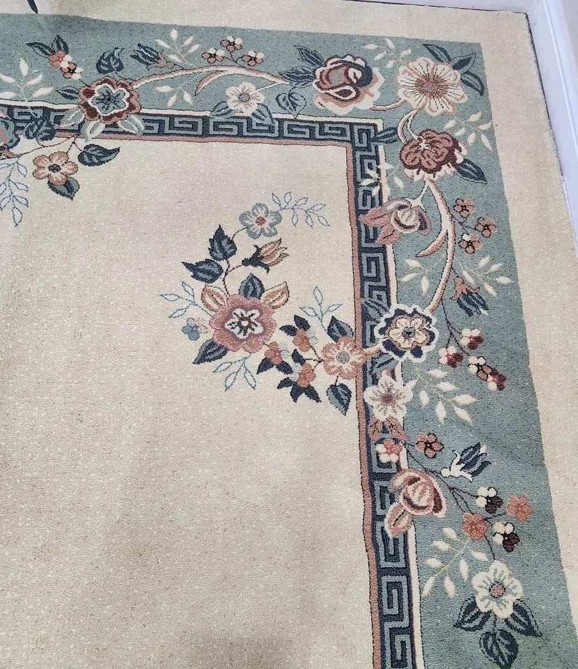 Very big carpet can fit in a living room area. Colours are off white cream and some turquoise and pink. Soft and beautiful.