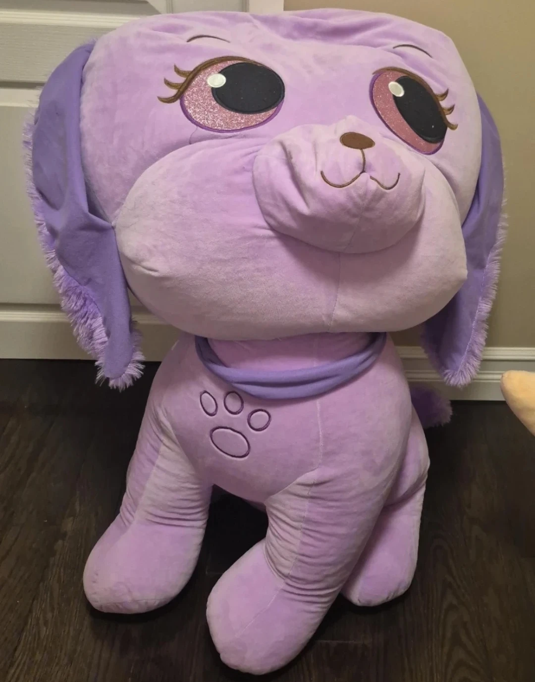 21Selling a large, cuddly purple plush puppy dog! It's in great condition and ready for a new home. This adorable plush features cute details like sparkly eyes and a paw print design on its collar. Perfect for kids or anyone who loves a big, soft friend!