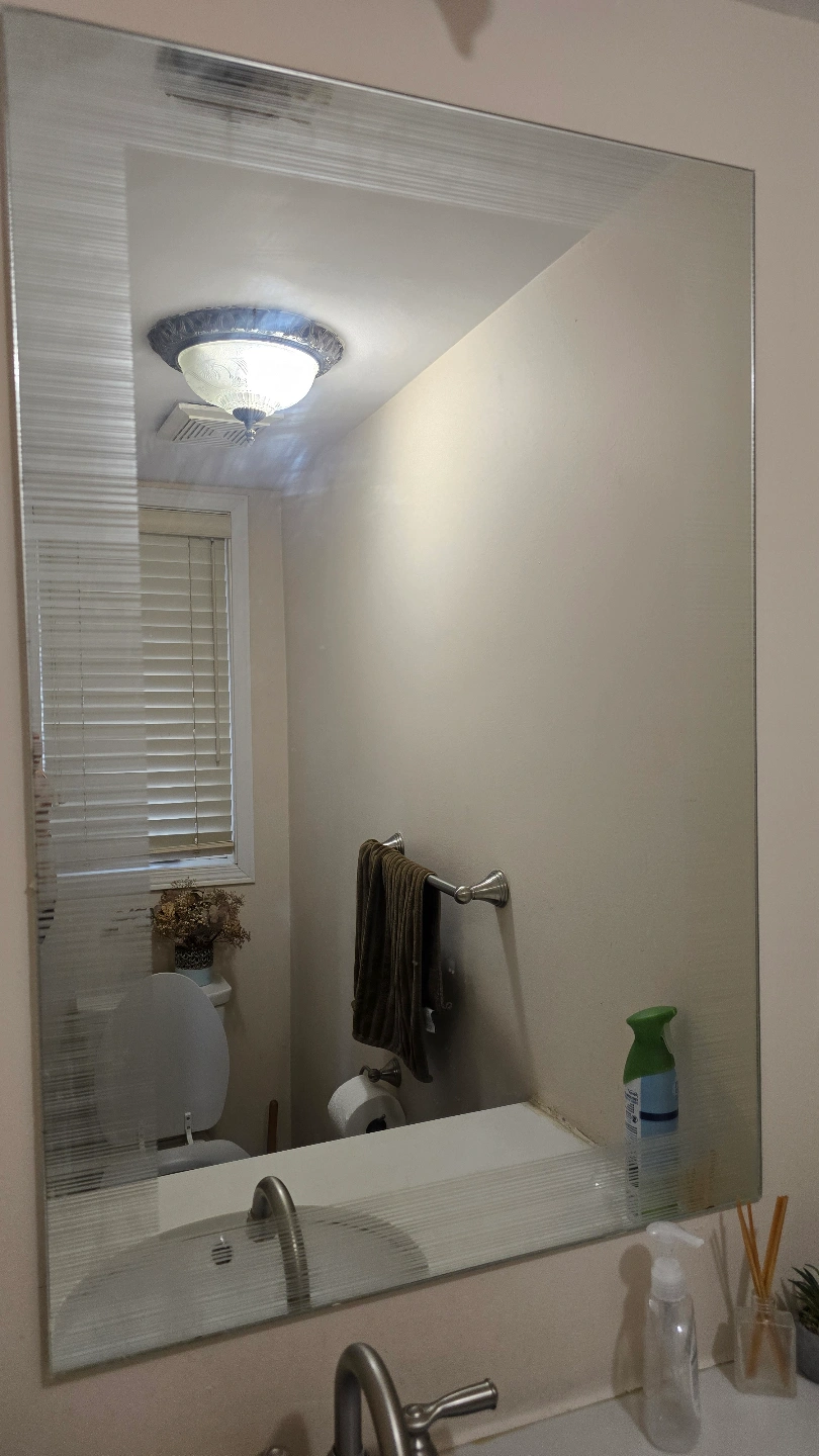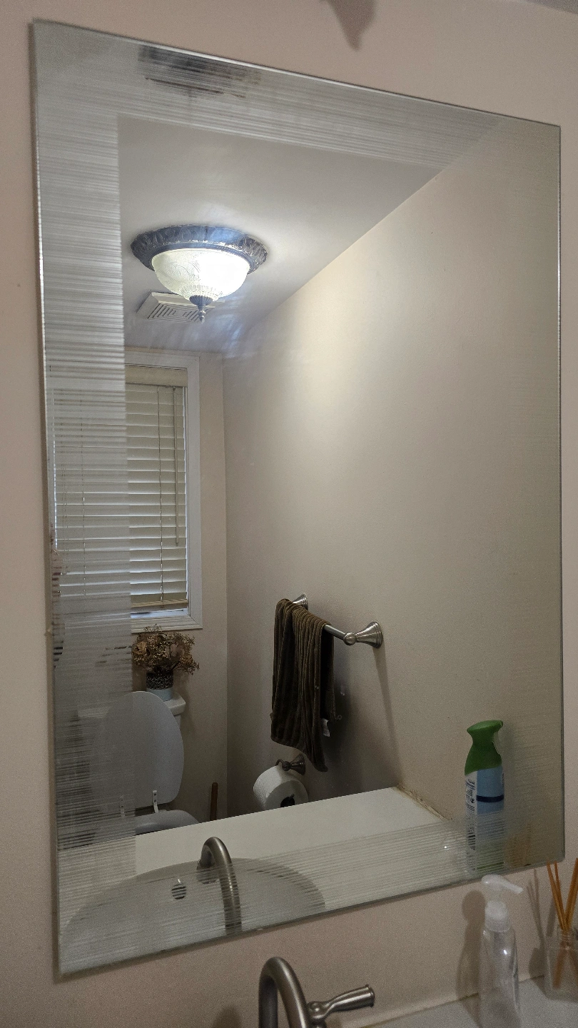 129Beautiful bathroom mirror. Features an etched border. Great for adding style to your bathroom or any room. Will be cleaned prior to pick up. The mirror is in perfect condition and has no breakage, cracks or scratches 2ft W x 3ft tall