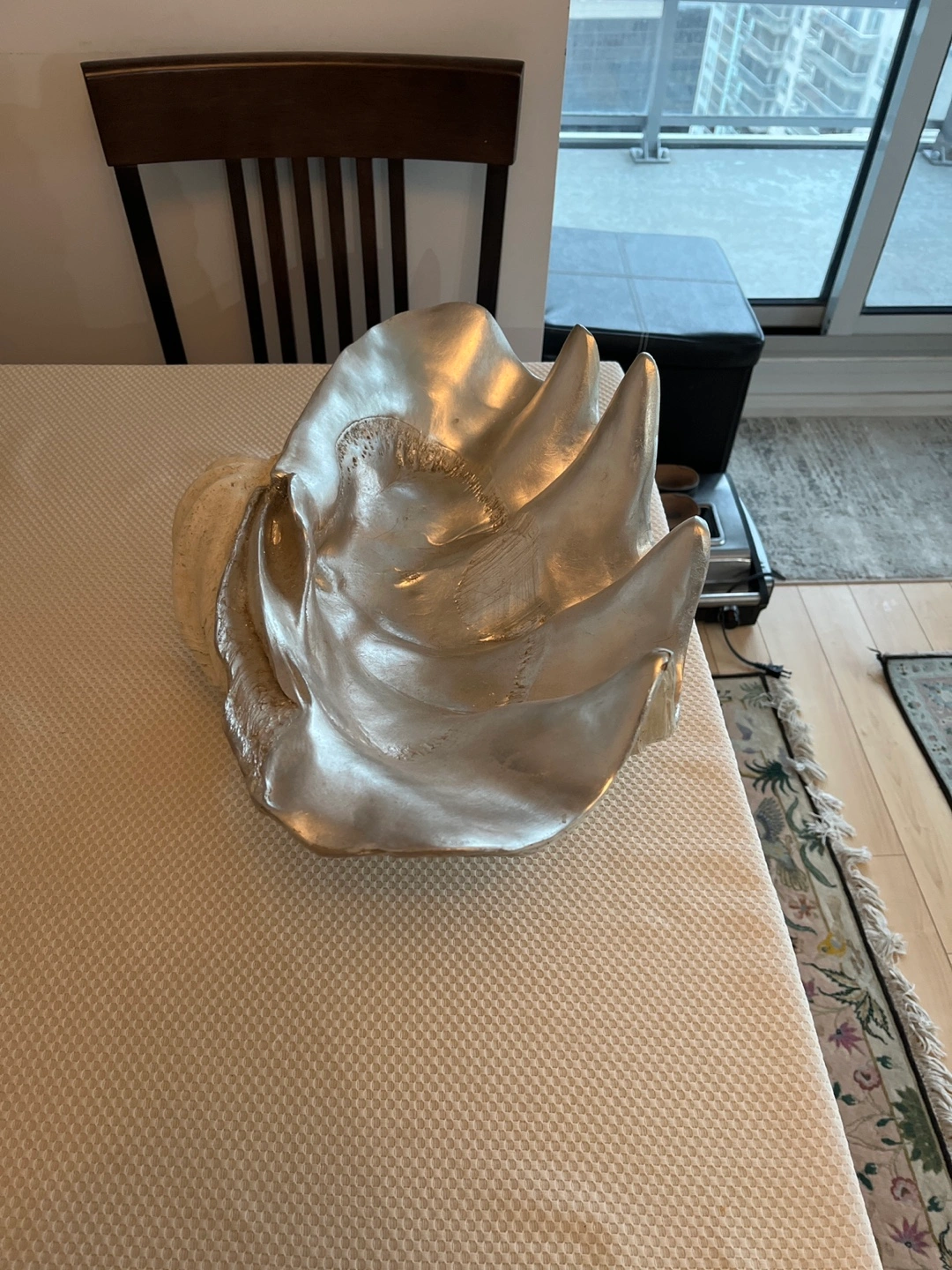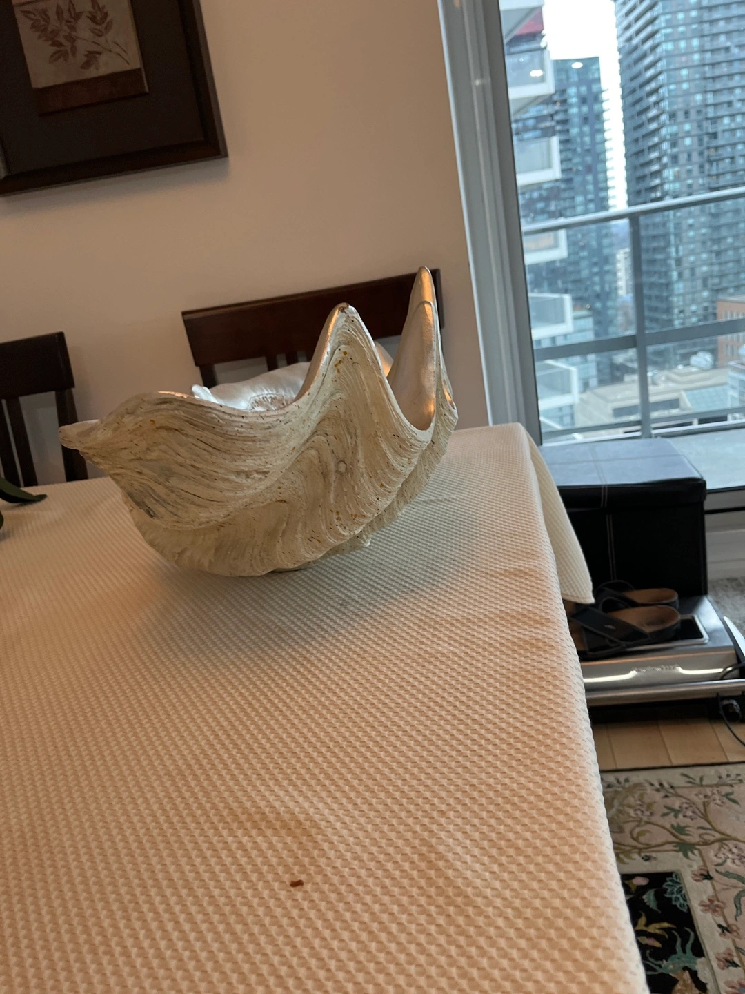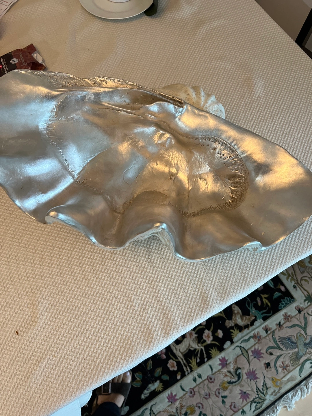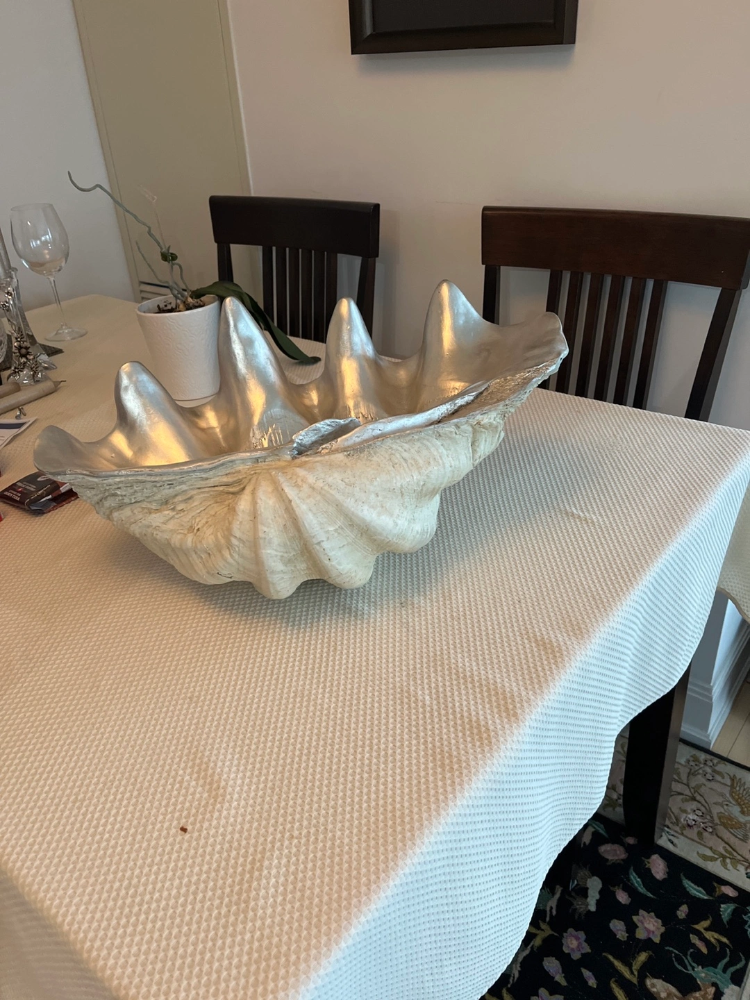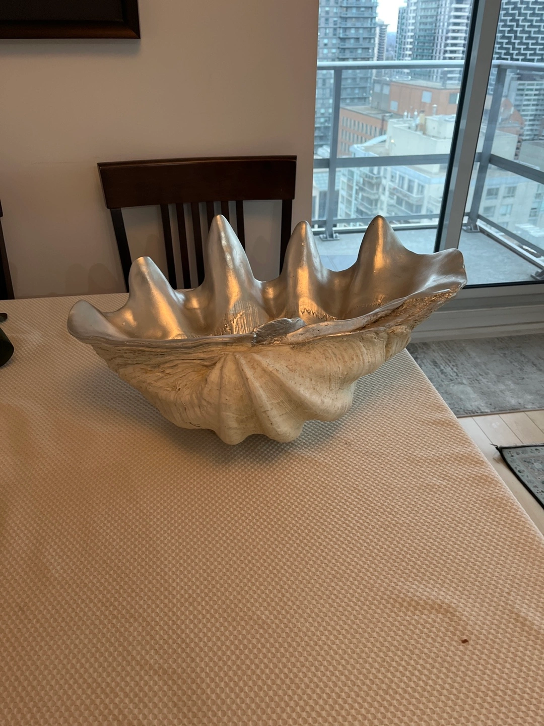Large clam shell, silver in colour. Would make a great decorative piece.