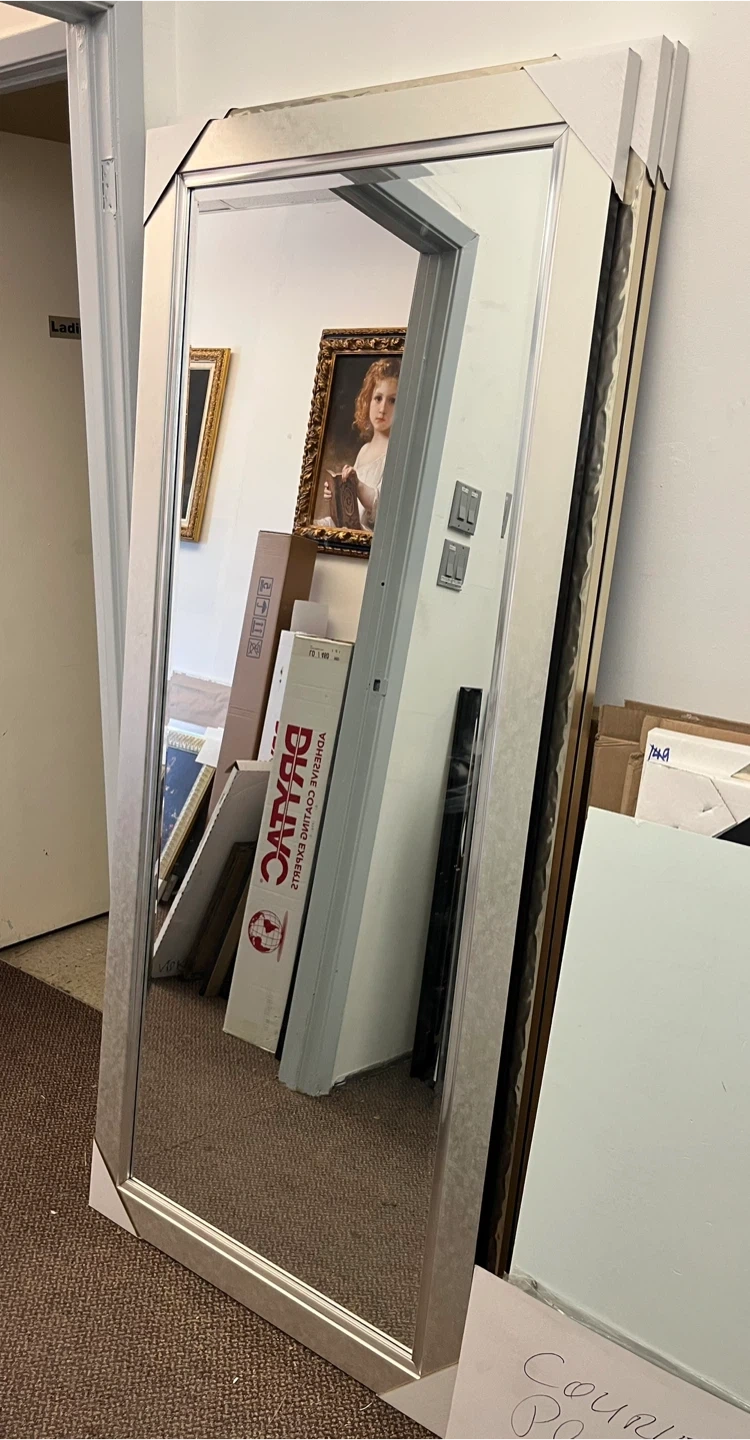 Selling a large mirror with a silver frame. It's new and ready to brighten up any room. Perfect for a bedroom, living room, or entryway. The frame adds a touch of elegance to the overall look