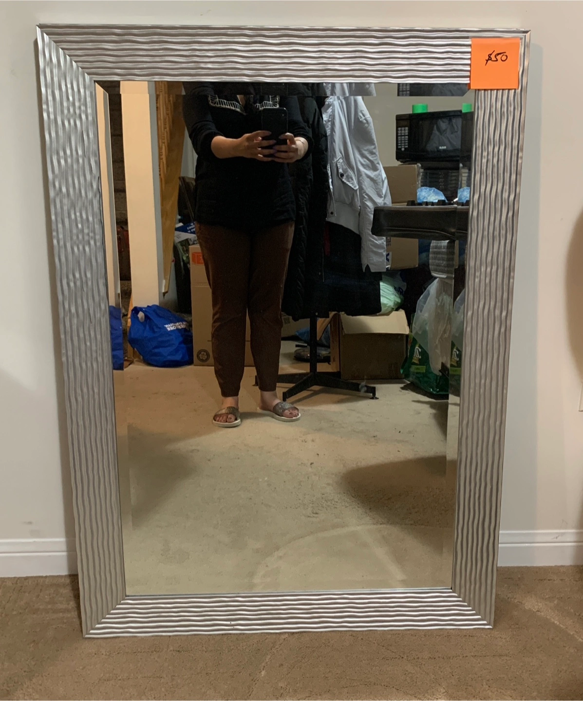 Selling a large mirror with a silver frame. It's in good condition and ready to brighten up your space!