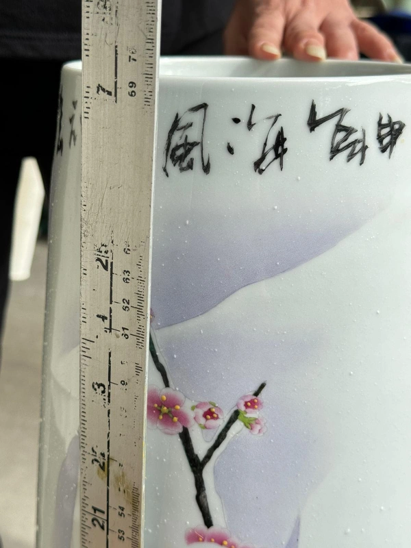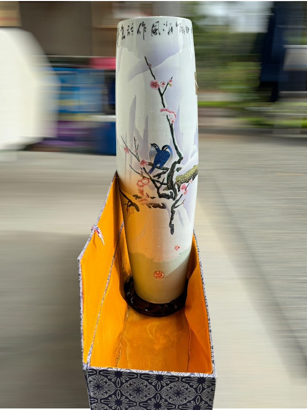 182Brand new large tall Chinese Style hand painted ceramic vase. Features a painted design of birds on a branch with blossoms and Chinese characters. Approximately 70cm tall, 15cm diameter. Comes in a protective box.