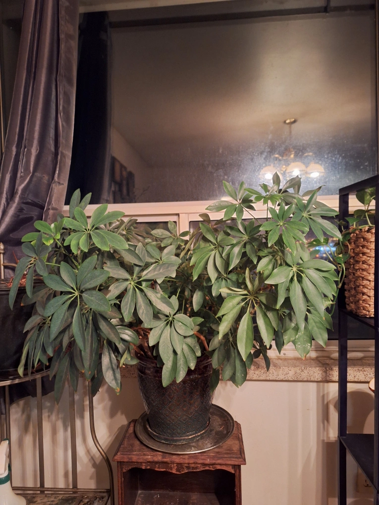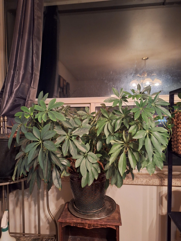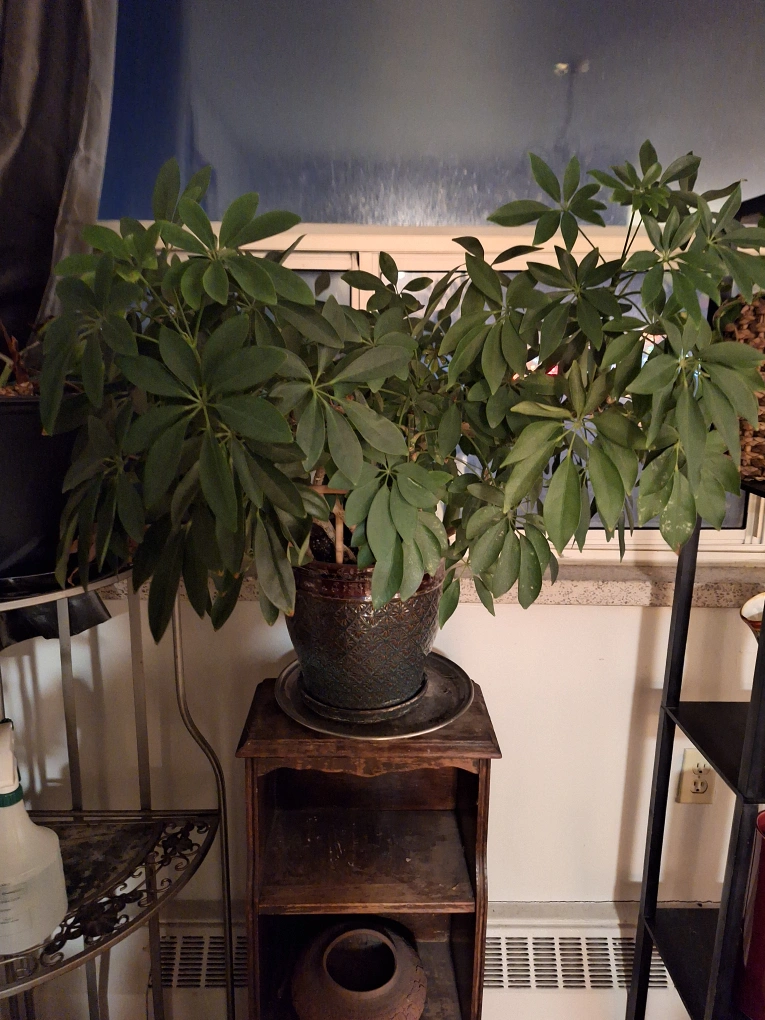 23Large umbrella plant in a decorative pot. The plant is approximately 4 feet tall and 4 feet wide. It has beautiful green leaves. It would be a great addition to any home.