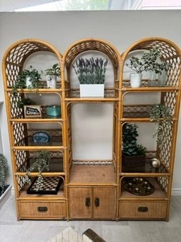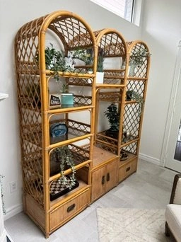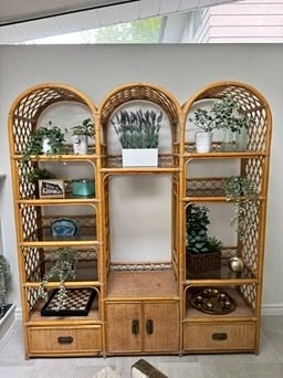 Add a touch of bohemian charm or mid-century flair to your home with this stunning, vintage bamboo étagère! Era/Style: Likely 1970s, vintage rattan/bamboo Hollywood Regency or Boho style Size: Very large statement piece—great for living rooms, sunrooms, offices, or open concept spaces. Measurements: 69”W x 78” H x 18” deep Features:Beautiful triple arch top Sturdy bamboo and rattan frame (single piece construction) Removable tempered glass shelves Three bottom drawers/cabinets for hidden storage Excellent condition for age; minor wear adds to vintage character Rare and hard to find in this size and quality Notes: This is a very solid, heavy-duty unit—buyer must bring help for pickup Likely unmarked, but similar pieces are attributed to 1970s Asian, American, or Italian rattan furniture makers Accessories/plants not included Asking price: $500 Pick up only in South Rosebank Pickering
