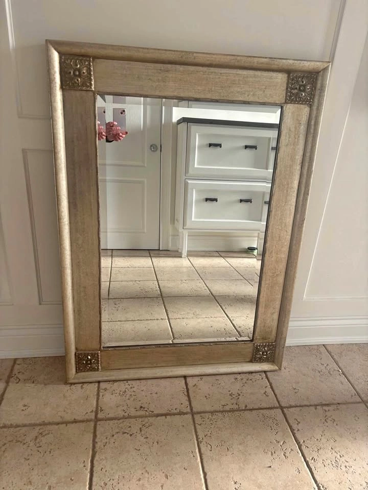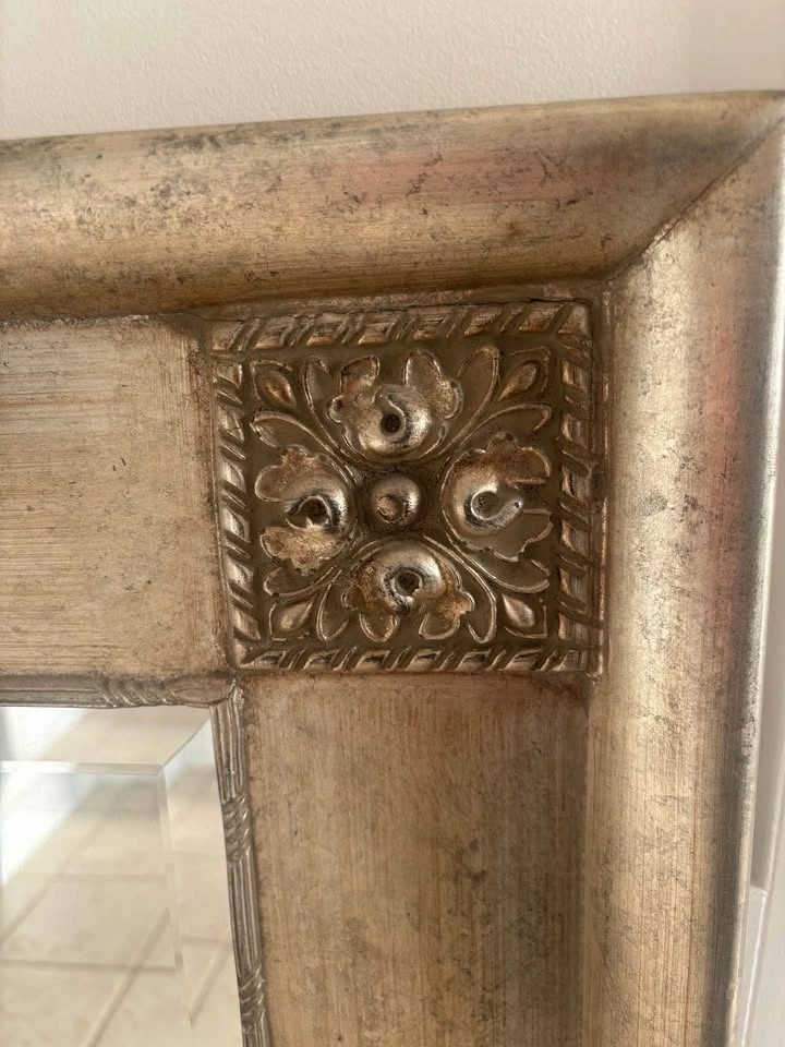 10Large decorative wall mirror. Heavy solid frame. Metallic soft gold/champagne colour. 34”x46.5”. Pet Free Non-Smoking home.