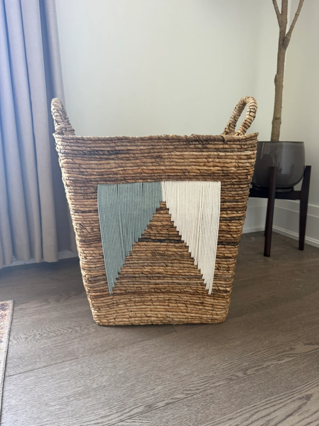 Selling a woven basket with thread work pattern in teal on two sides. Good for laundry or as a catch all. Height 19” Width 19” In perfect condition. No damage.
