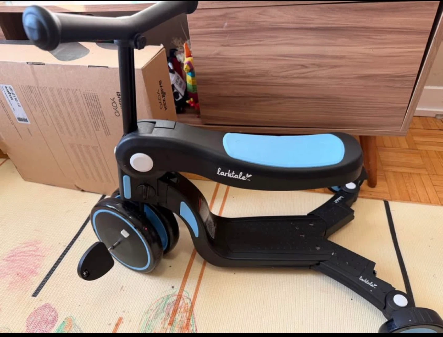 70Check out this Larktale convertible scooter and ride-on toy! It's perfect for little ones who are learning to balance and coordinate. The scooter easily converts to a ride-on toy, so your child can enjoy it in different ways. The color is a sleek black with blue accents. This is a great way to get your kids moving and having fun!