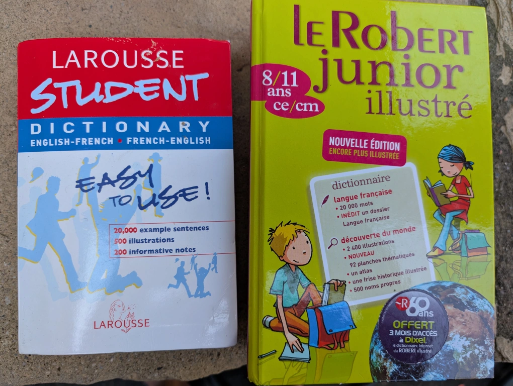 Selling a Larousse Student Dictionary (English-French) and Le Robert Junior Illustré dictionary. The Larousse dictionary is easy to use and includes 20,000 example sentences, 500 illustrations, and 200 informative notes. Le Robert Junior Illustré is a new edition with over 2,400 illustrations, 92 thematic boards, an atlas, a historical timeline, and 500 proper nouns