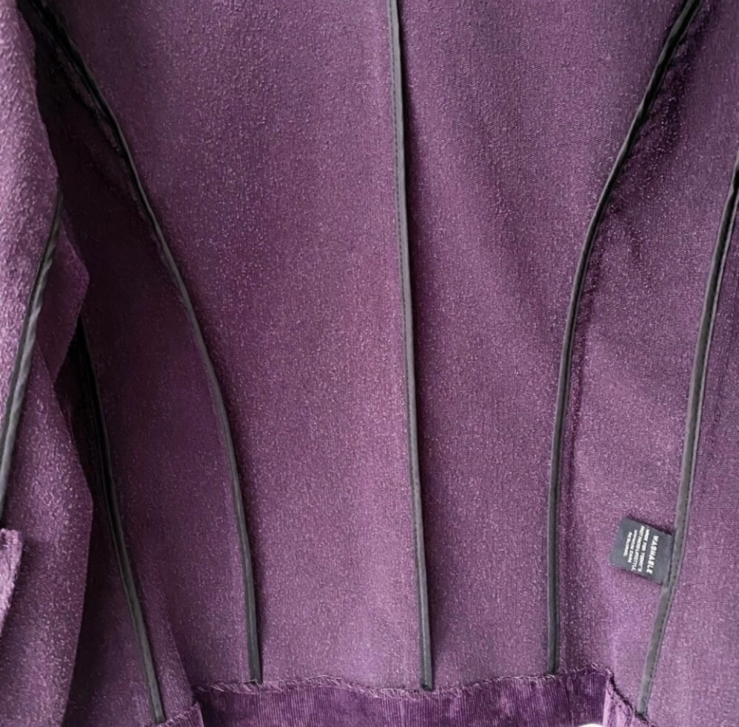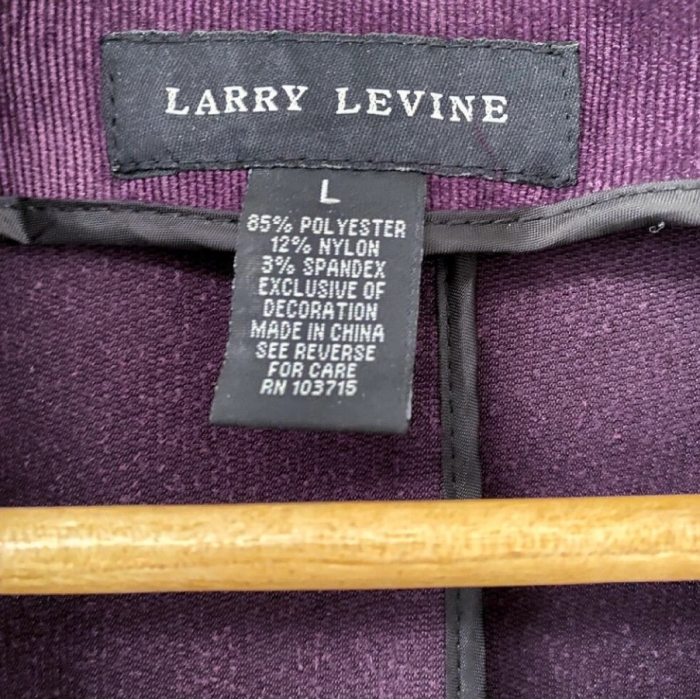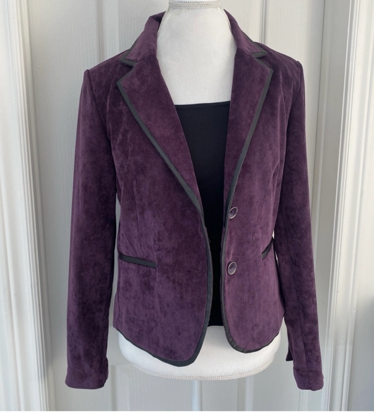 247Larry Levine - Vintage Velveteen like corduroy. Purple blazer with black trim. Two button closure. In excellent used condition, Lightly worn! Beautiful jacket! Size: Large (19 1/2” pit to pit) Material: 85%polyester/ 12% Nylon/ 3% Spandex • Two front pockets are not real • Lovely collar • Figure flattering Purchased for $100. Comes from a pet free, smoke free home Pick up Pickering: Altona & Sheppard or Toronto: Greenwood & Gerrard