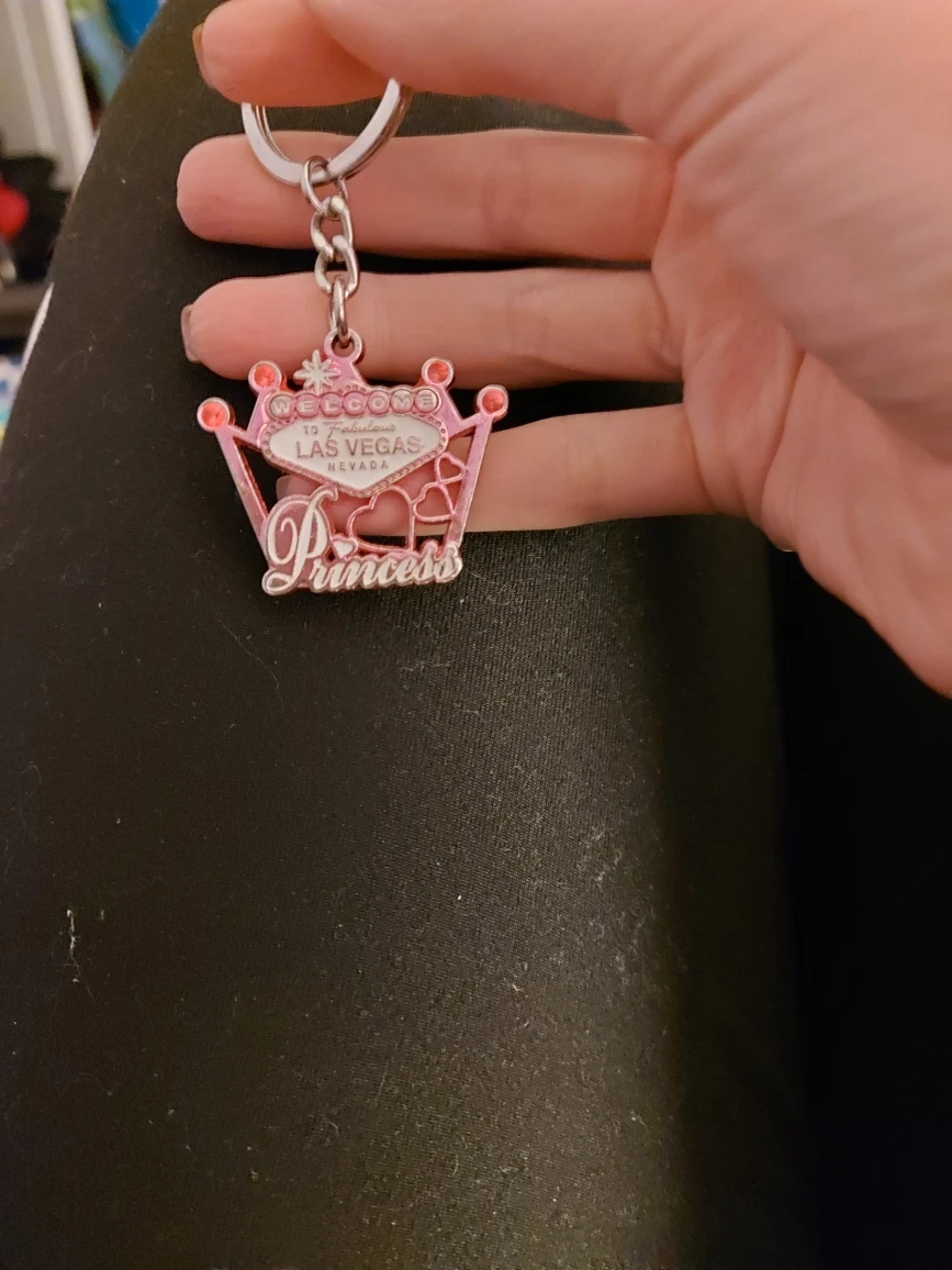 15Cute Las Vegas Princess keychain! It features the iconic 'Welcome to Fabulous Las Vegas Nevada' sign in a pink crown design. Perfect for adding a touch of Vegas to your keys or bag