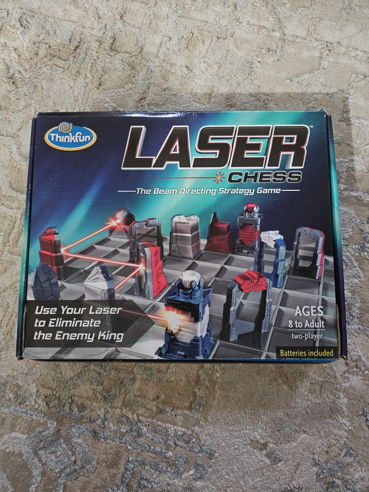 Complete Laser Chess game. Beam-directing strategy game. Two-player game. Ages 8 to adult. Includes game board and pieces.