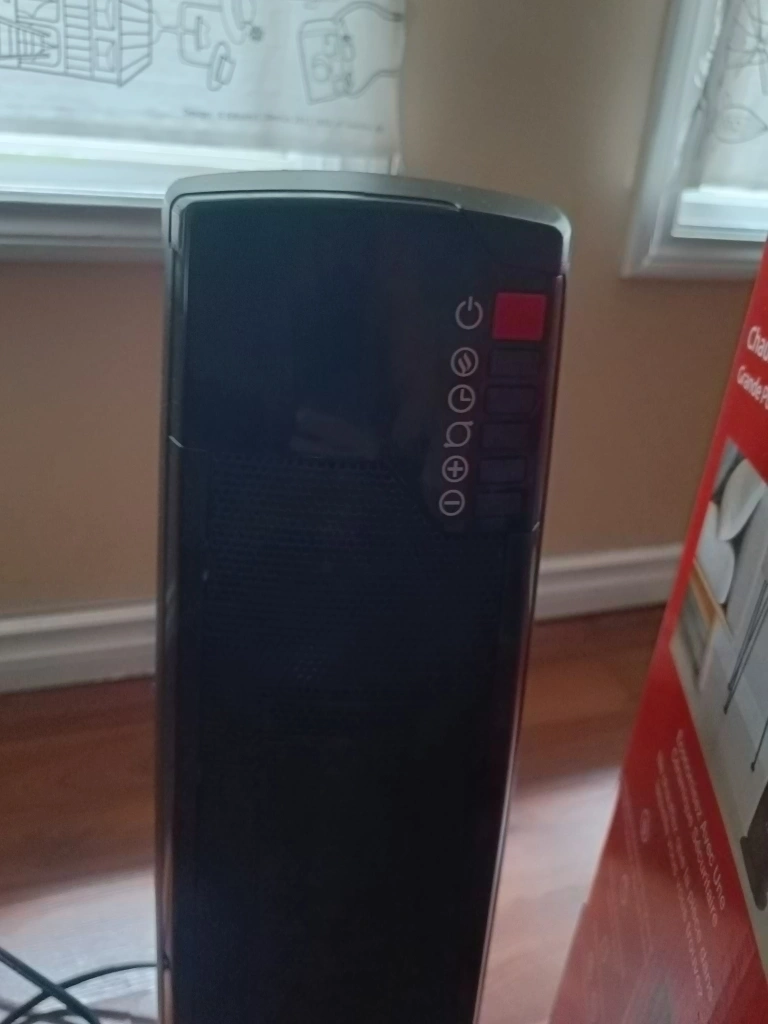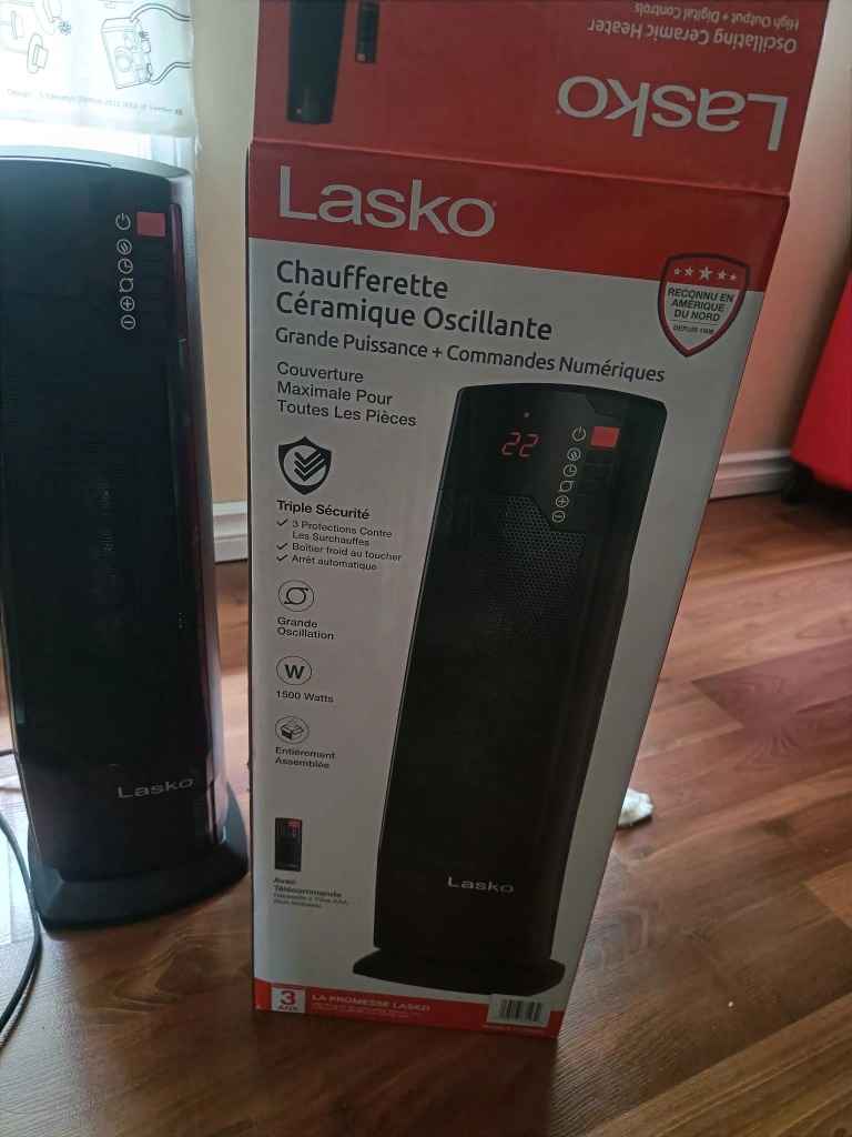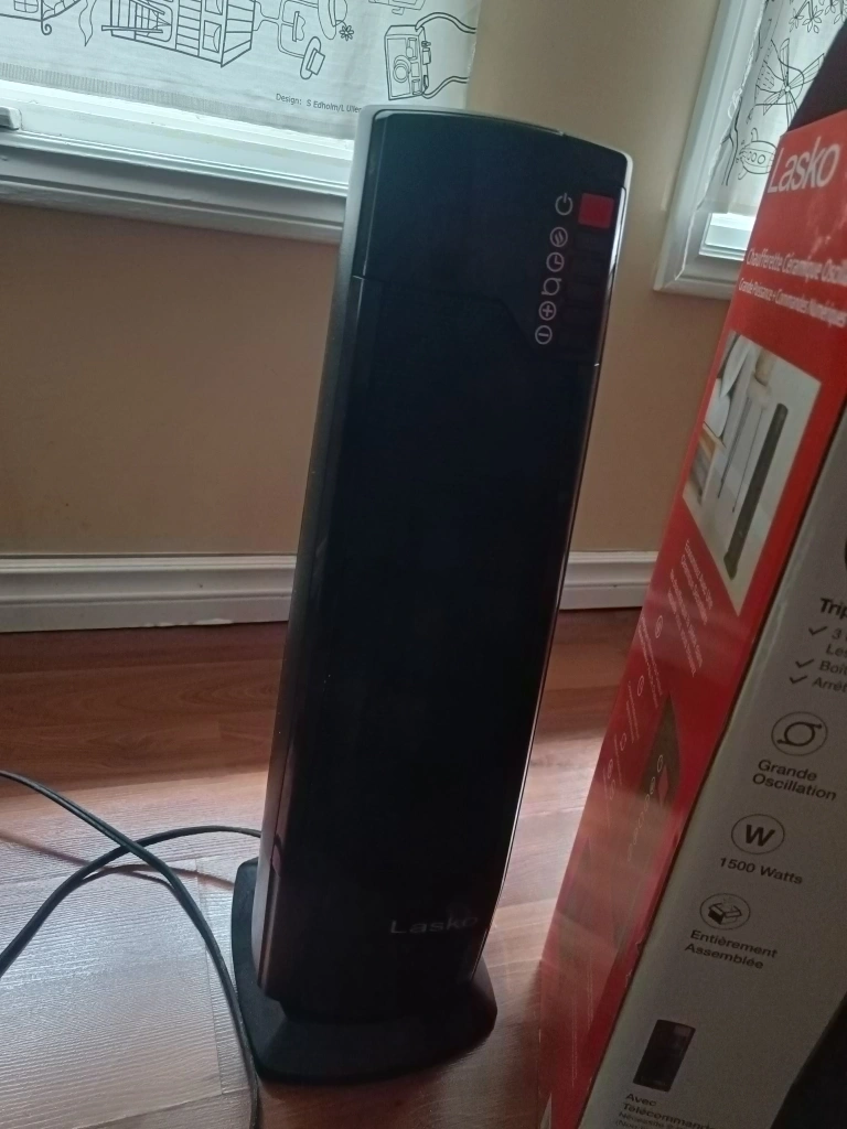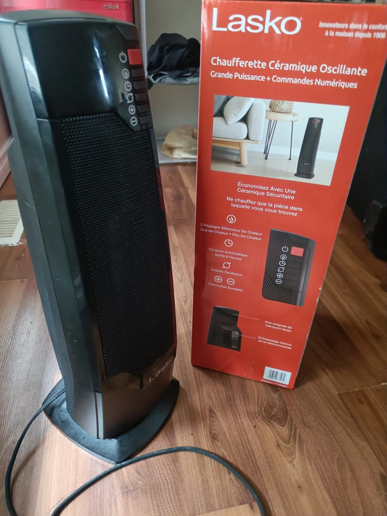 Keep cozy with this Lasko ceramic tower heater! Hardly used 3 times. Reason to sale :- shifting to other country permanently. It features digital controls, oscillation for even heat distribution, and multiple safety features for peace of mind. It's a 1500-watt heater with a remote control. The box is included!