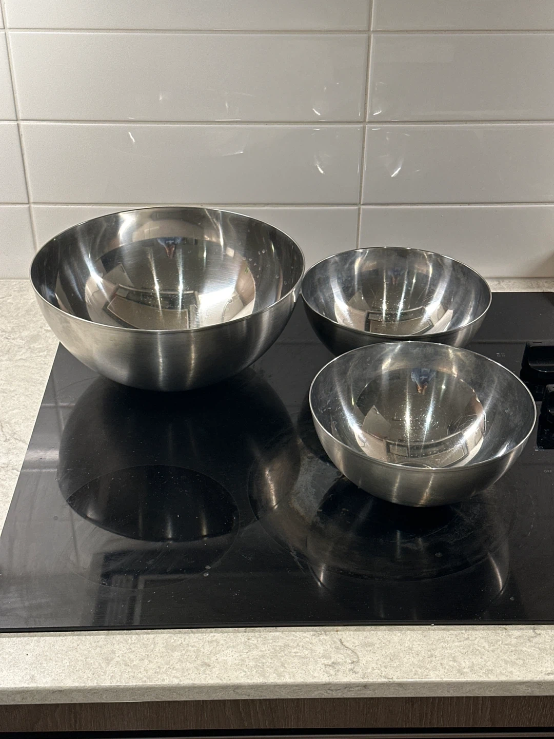 396Selling a set of three stainless steel mixing bowls! They're in great shape and perfect for all your cooking and baking needs
