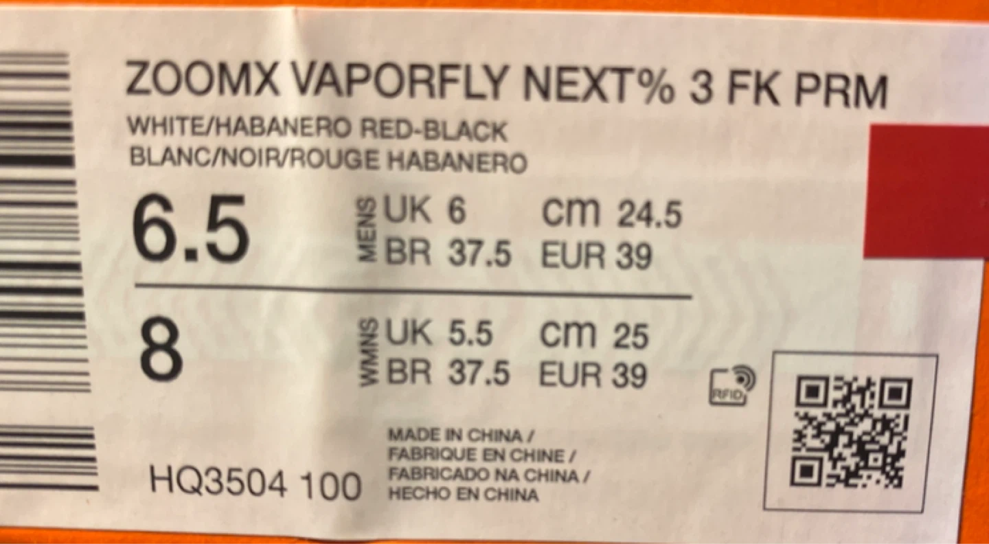 Selling a pair of Nike Vaporfly 3 running shoes! They feature a cool white and red flames design. They are size US 6.5 Men’s or Women’s 8. Perfect for runners looking for lightweight performance! They have only been used ONCE! (5km run) Original box included. The price is $290, but I’m happy to negotiate! The listing will be taken down in two days, so if you’re interested, act now.