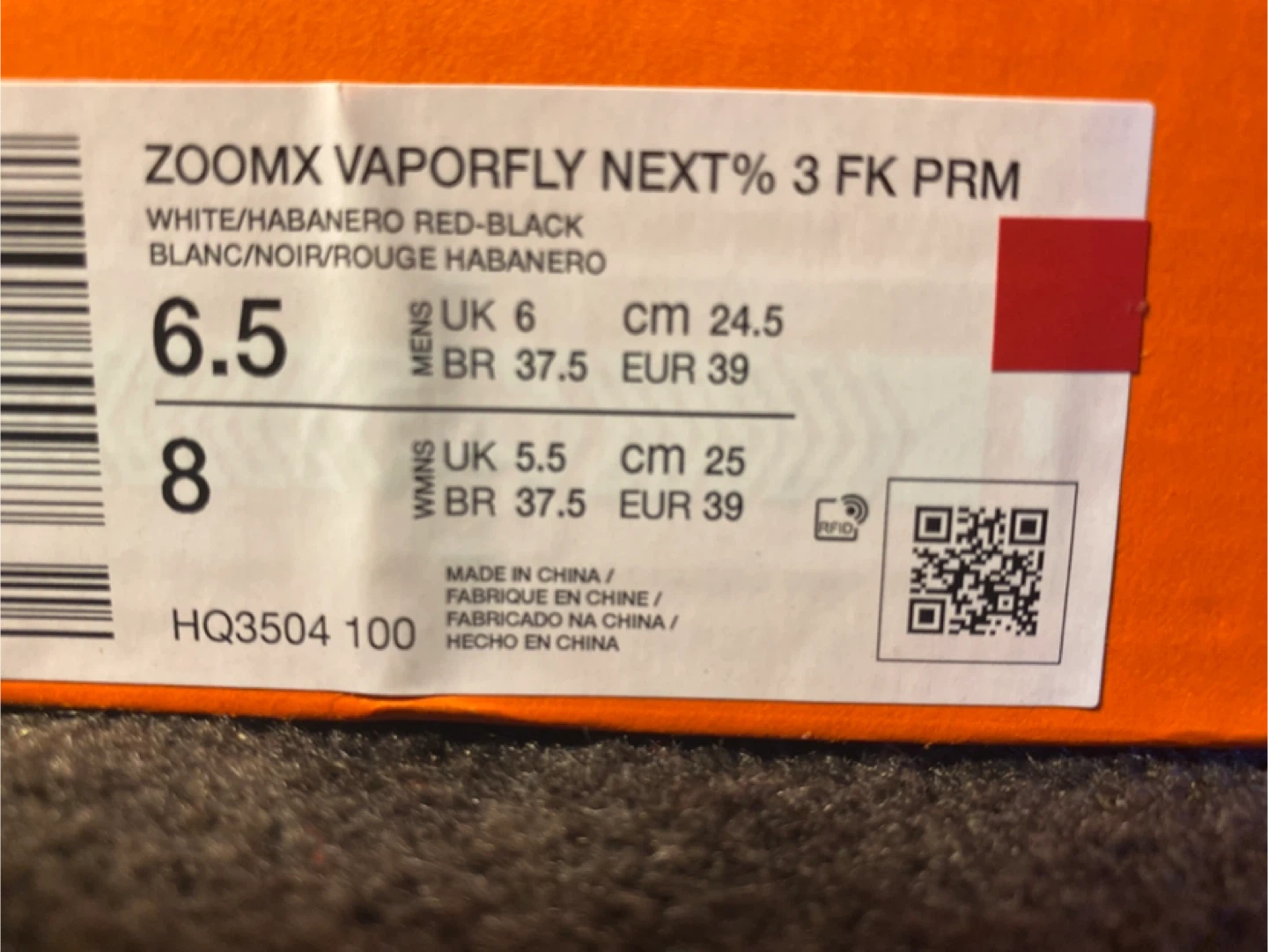 Selling a pair of Nike Vaporfly 3 running shoes! They feature a cool white and red flames design. They are size US 6.5 Men’s or Women’s 8. Perfect for runners looking for lightweight performance! They have only been used ONCE! (5km run) Original box included. The price is $290, but I’m happy to negotiate! The listing will be taken down in two days, so if you’re interested, act now.