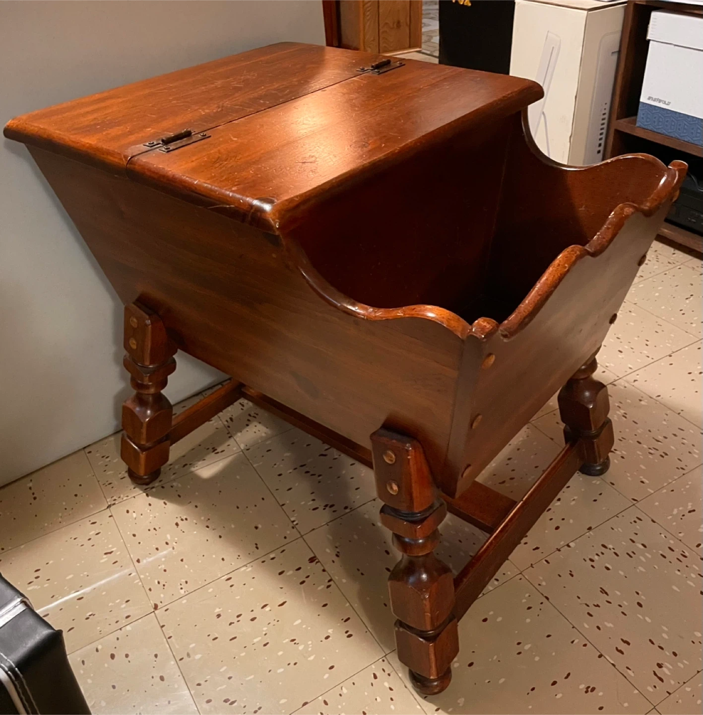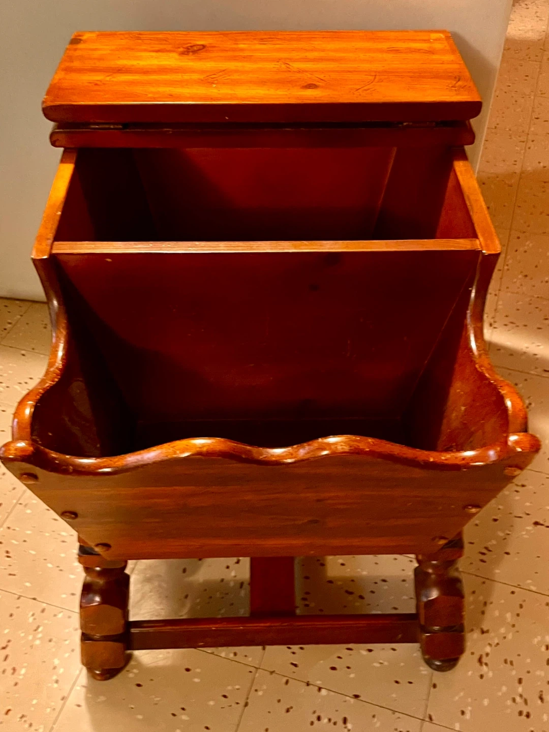 Solid pine end table with storage and built in magazine/book rack. Can store blankets, throws, toys, just about anything. Rare find. Very good condition. 20” W x 27.5 L x 23.5”H. Very useful. Attractive. Asking $50 or make me an offer. Check out my other listings too!