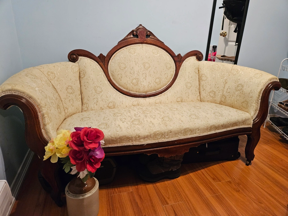 60This antique chaise belonged to my grandmother's family around the Acton, Ontario area. It is from the late 1800's and was reupholstered in the 1950's as well as the 1970's. Original wood frame is very sturdy. It is beautiful as a decor piece in a home, photographic or stage setting or as a functional sitting loveseat for 1 adult person.