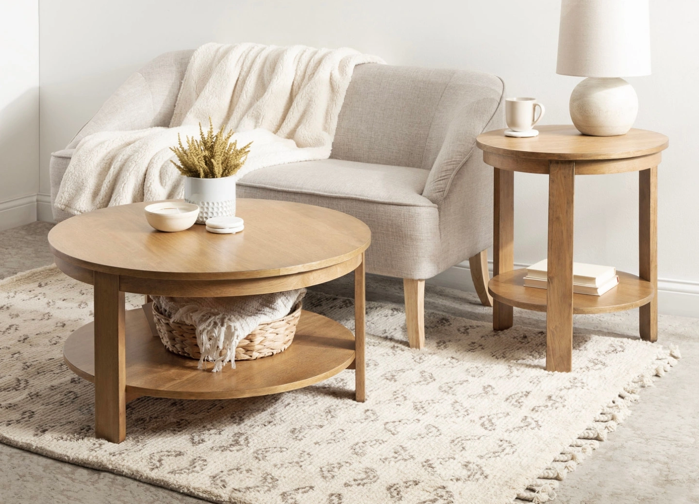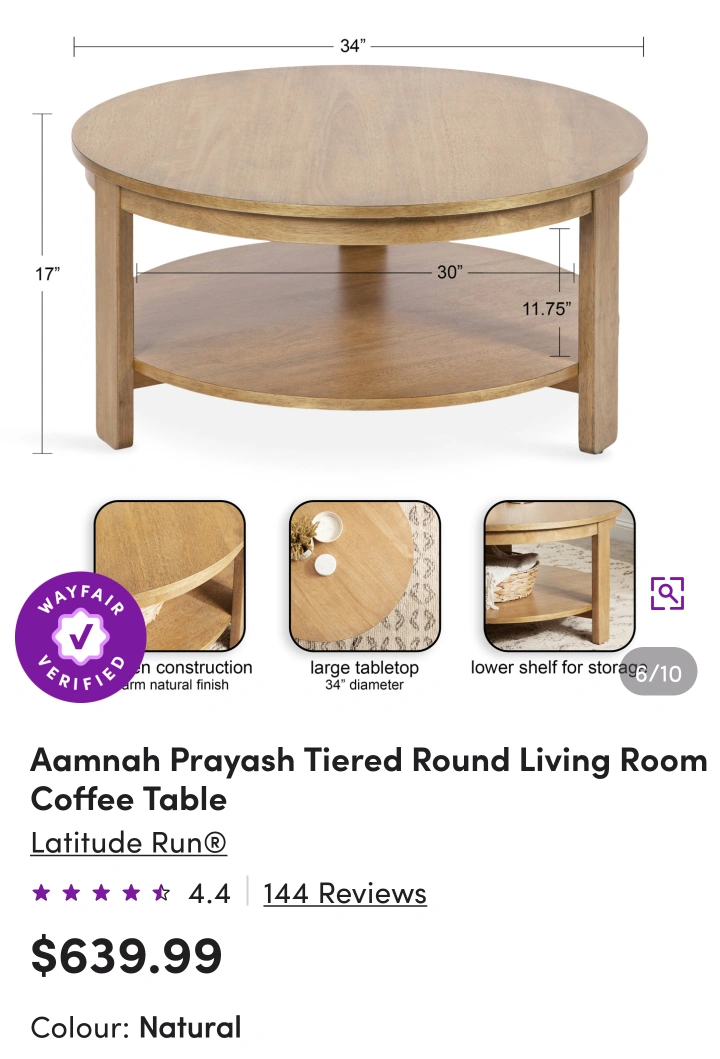 Selling a Latitude Run Aamnah Prayash Tiered Round Living Room Coffee Table in natural colour. It features: - 34" diameter - Lower shelf for storage - 17" height Originally bought for $723 ($639.99+tax)