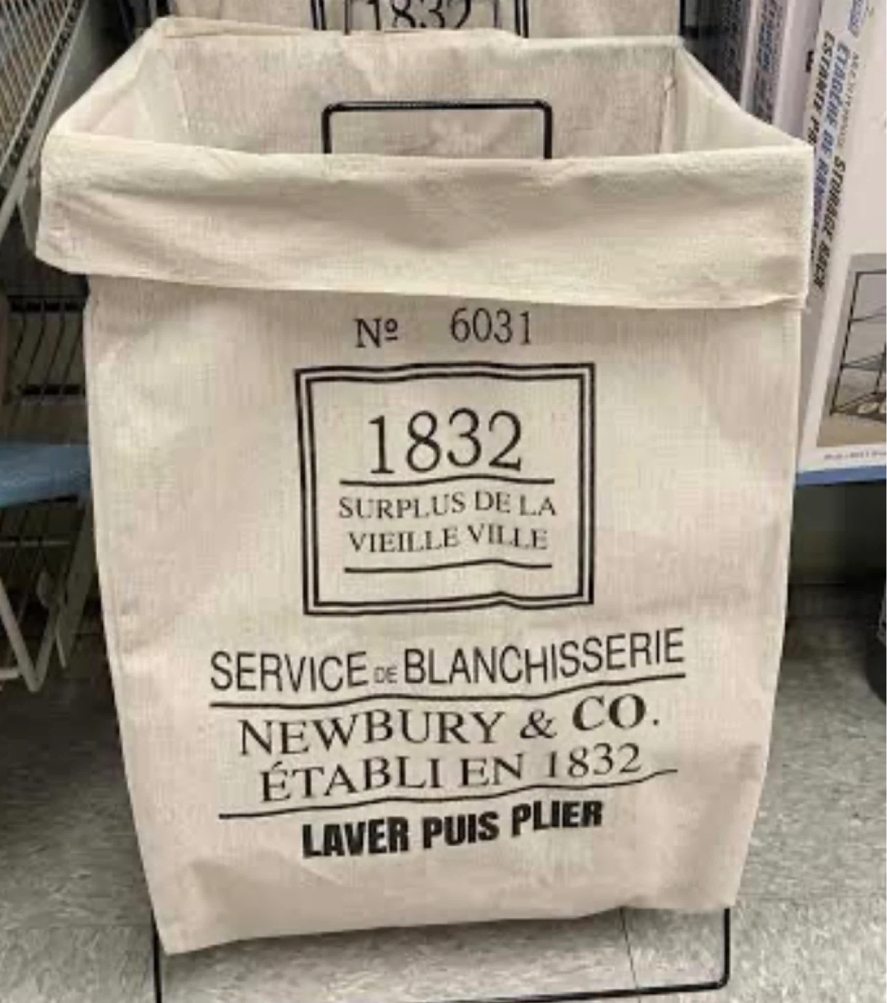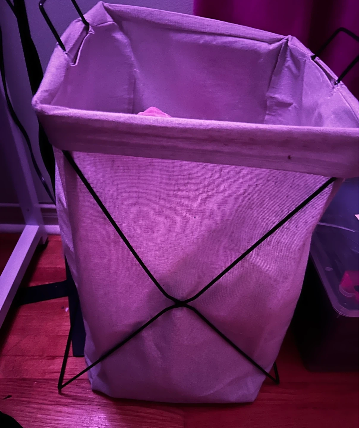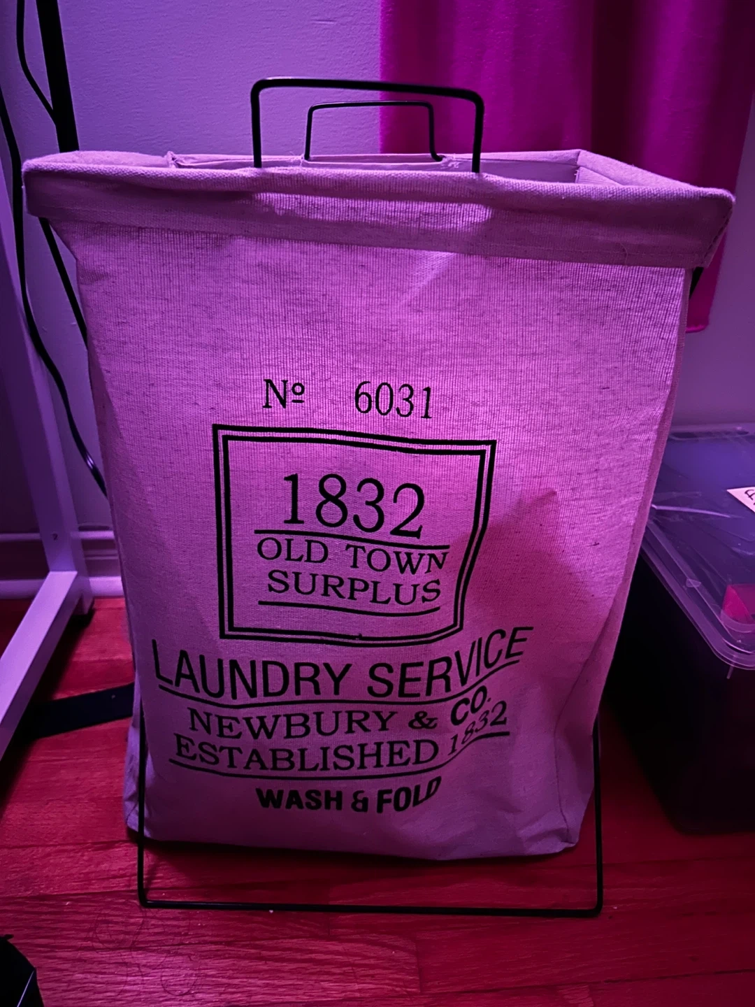 Laundry hamper with a metal frame and fabric bag. It can be folded in half length wise to save space when not in use. Perfect for keeping your laundry organized!