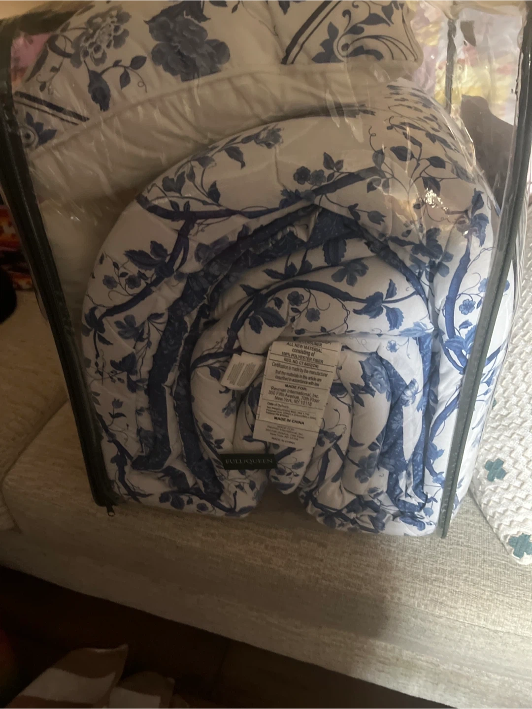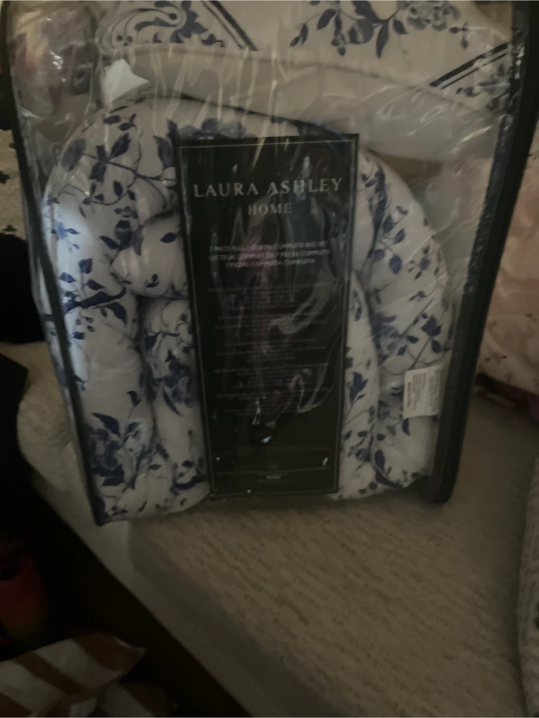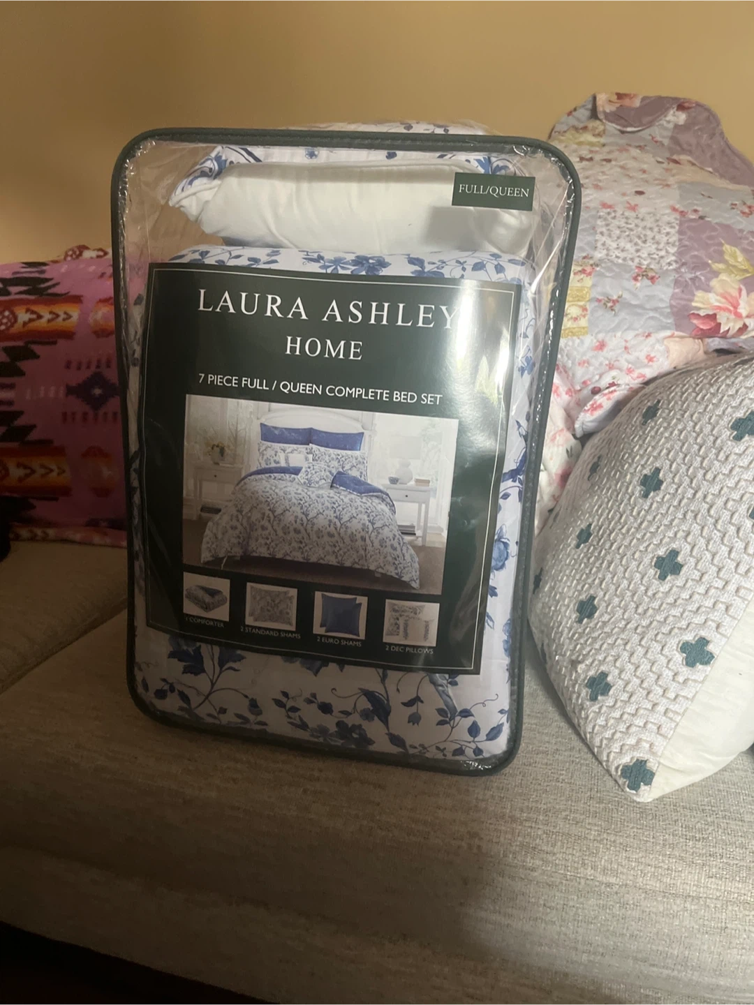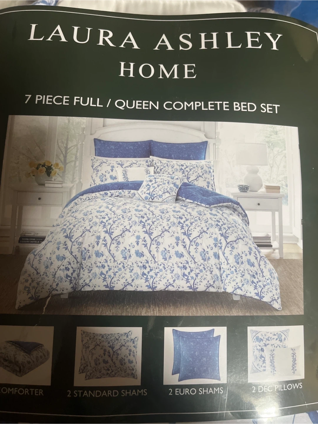 Selling a Laura Ashley Home 7-piece full/queen complete bed set. It features a beautiful blue and white floral pattern. Included are the comforter, two standard shams, two euro shams, and two decorative pillows. The set is still in its original packaging