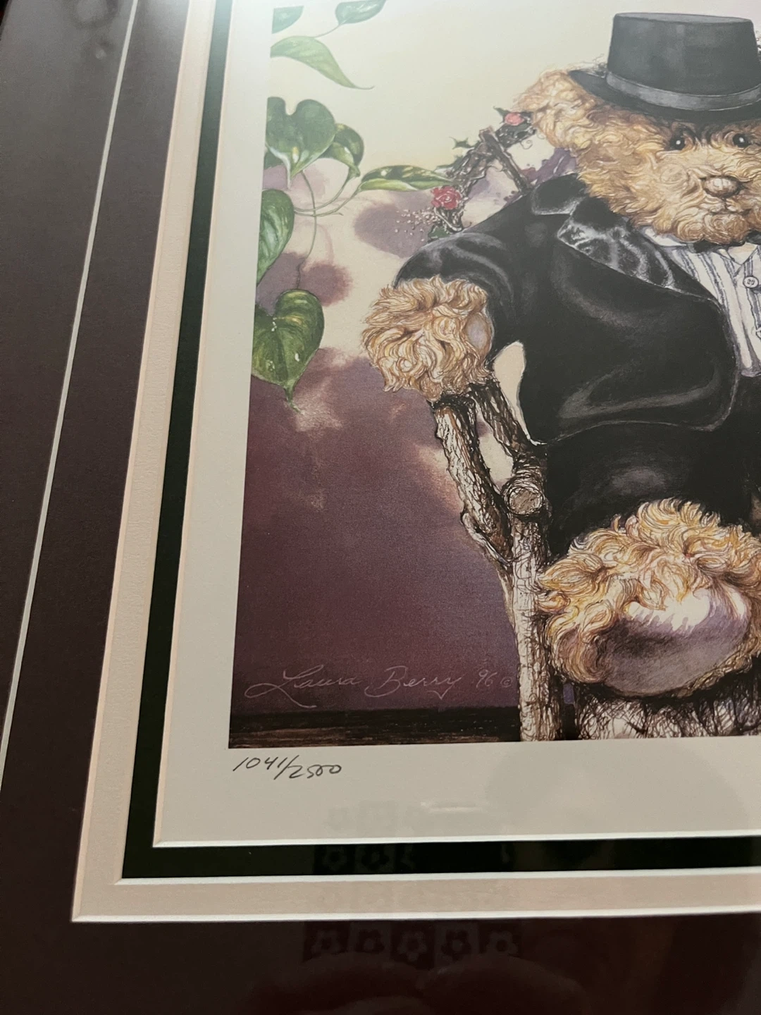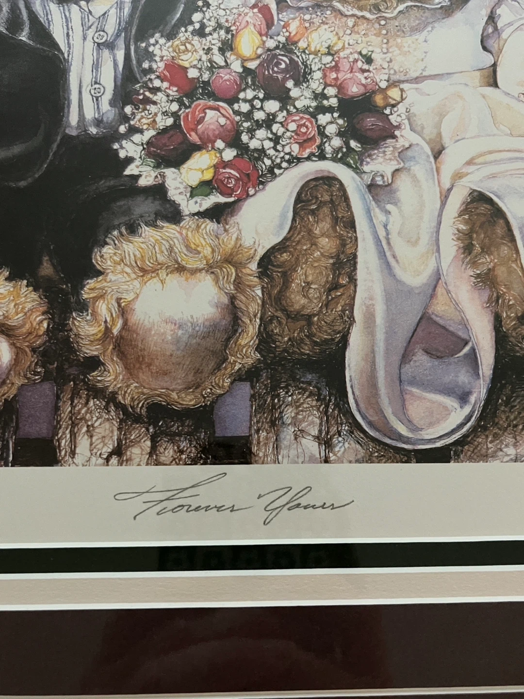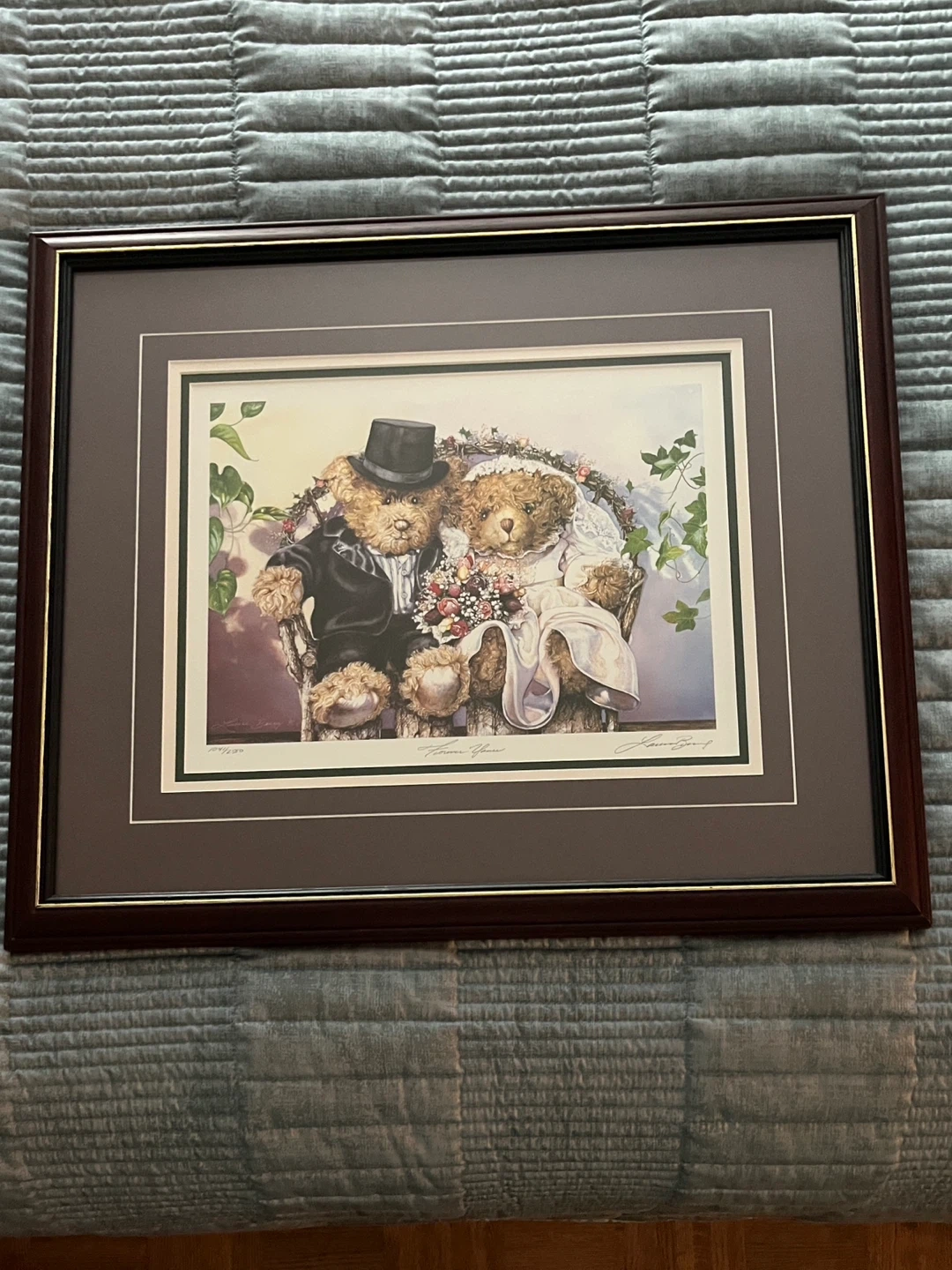 I'm selling a framed print by Laura Berry titled "Forever Yours"! It's numbered 1041/2500 and features a charming illustration of teddy bears in wedding attire. The print is in excellent condition and ready to add a touch of whimsy to any room