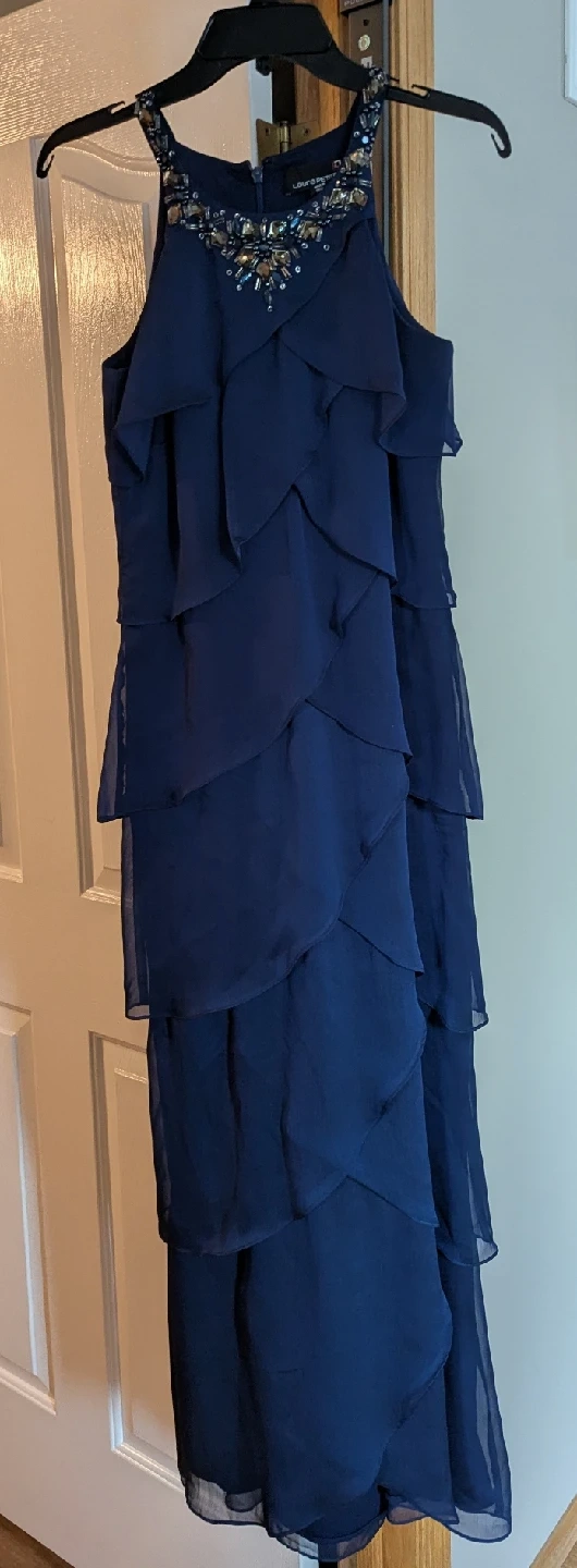 60Selling a beautiful Laura Petites gown in navy blue! It features a tiered design and is perfect for a special occasion. The dress has a halter neckline with beaded detailing.