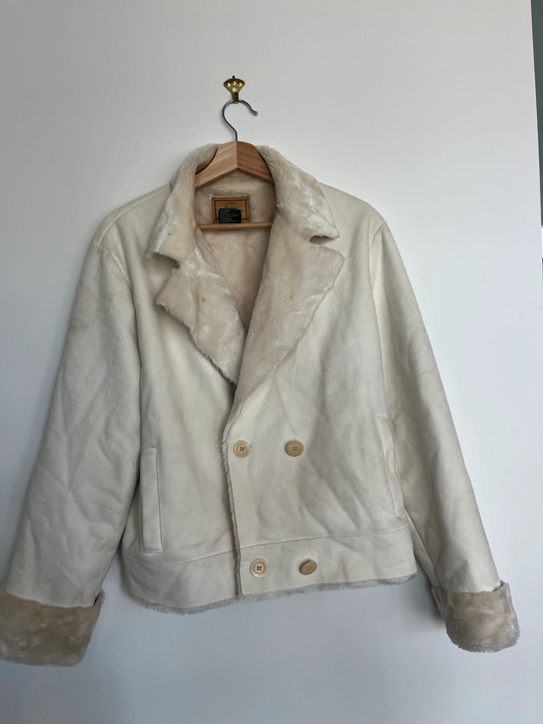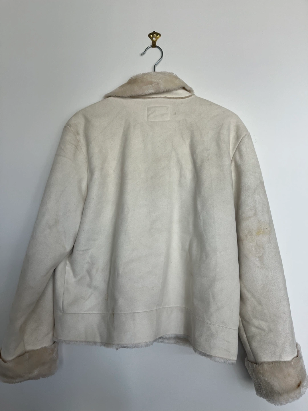 134Cozy up in this Lauren Furnishings jacket! It's a cream-coloured faux shearling jacket, perfect for adding a touch of warmth and style to your wardrobe. There are a few spots on the jacket, as pictured. Vintage jacket.