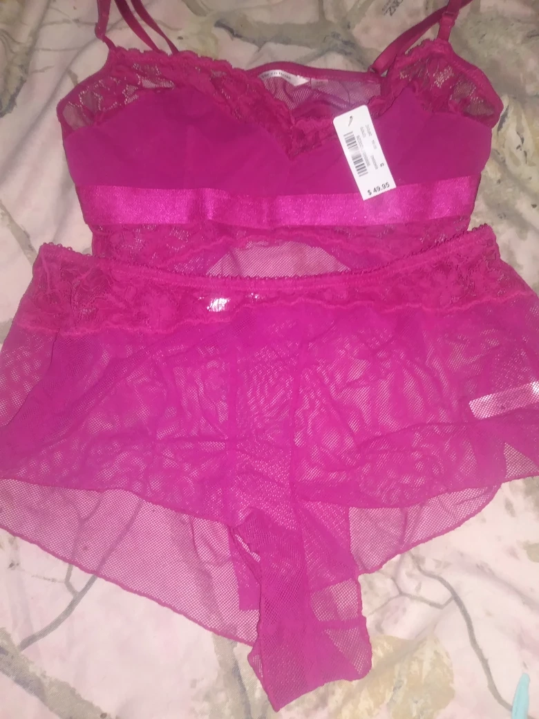 Hot pink lingerie set, size small. The tag shows it was originally $49.95. Perfect for a night in!