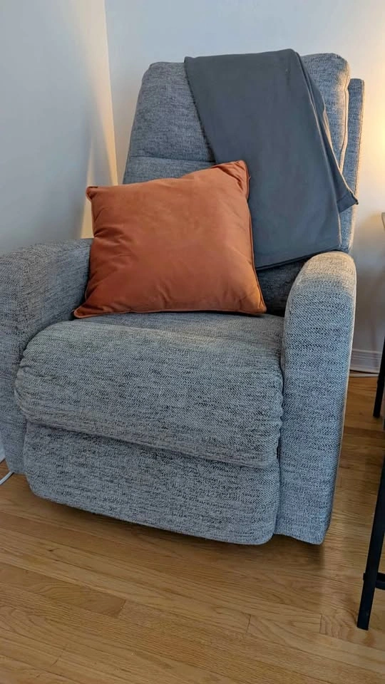 Gently used LazBoy recliner in grey. Mechanically perfect, everything works as it should. Super comfy. Foam is in great condition. Grey fabric has minor wear and tear. Will do a full vacuum and extraction before selling. No pets but a sibling's cat has occasionally been in the house so worthwhile noting it.