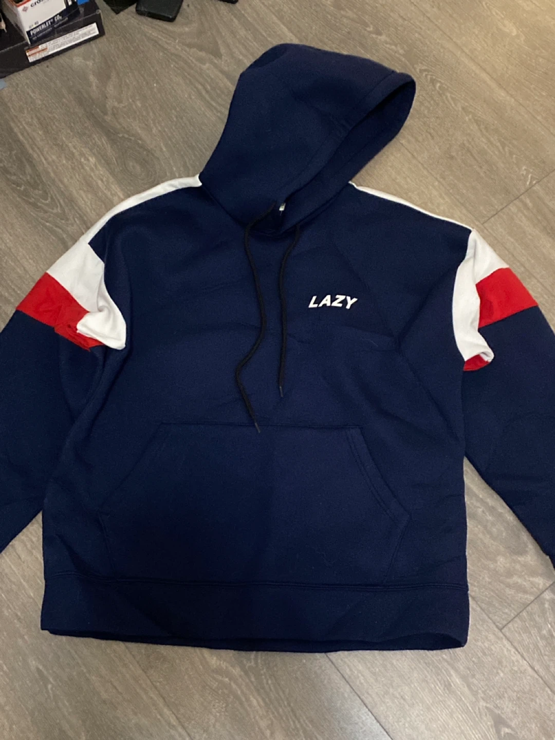 42Selling a comfy navy blue hoodie with a unique colour block design! It has white and red stripes on the sleeves and the word "LAZY" embroidered on the chest. Perfect for cozy days!
