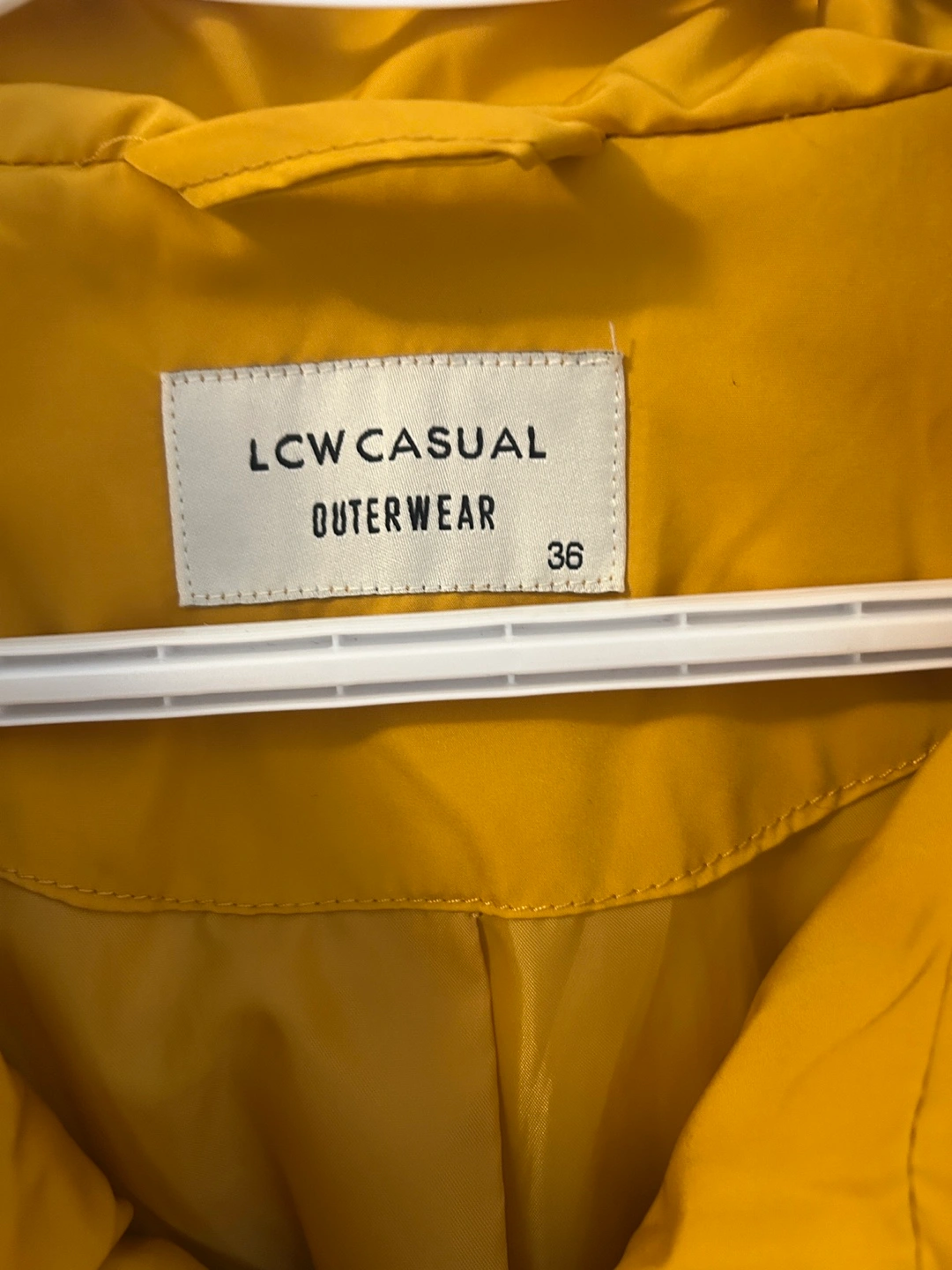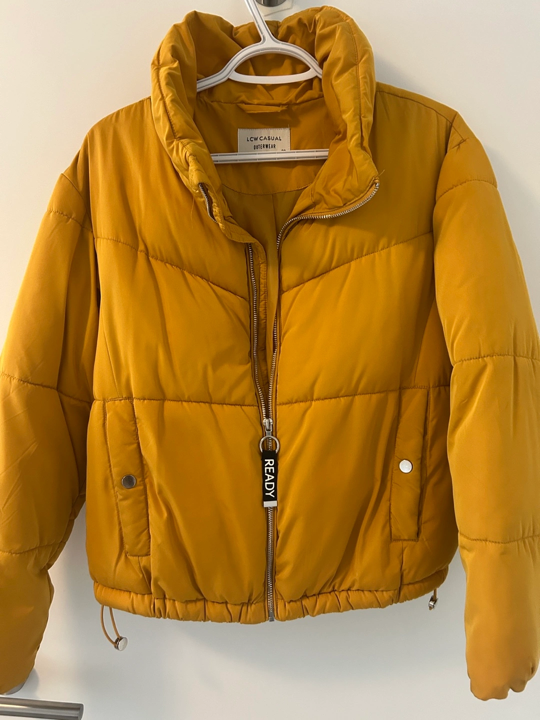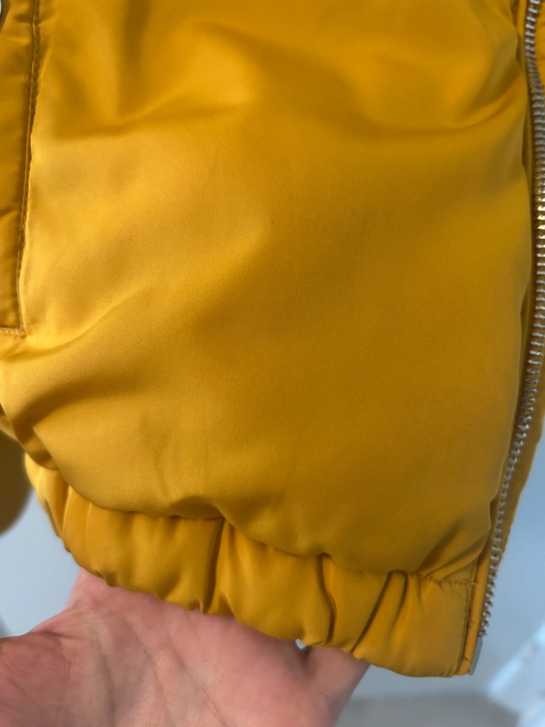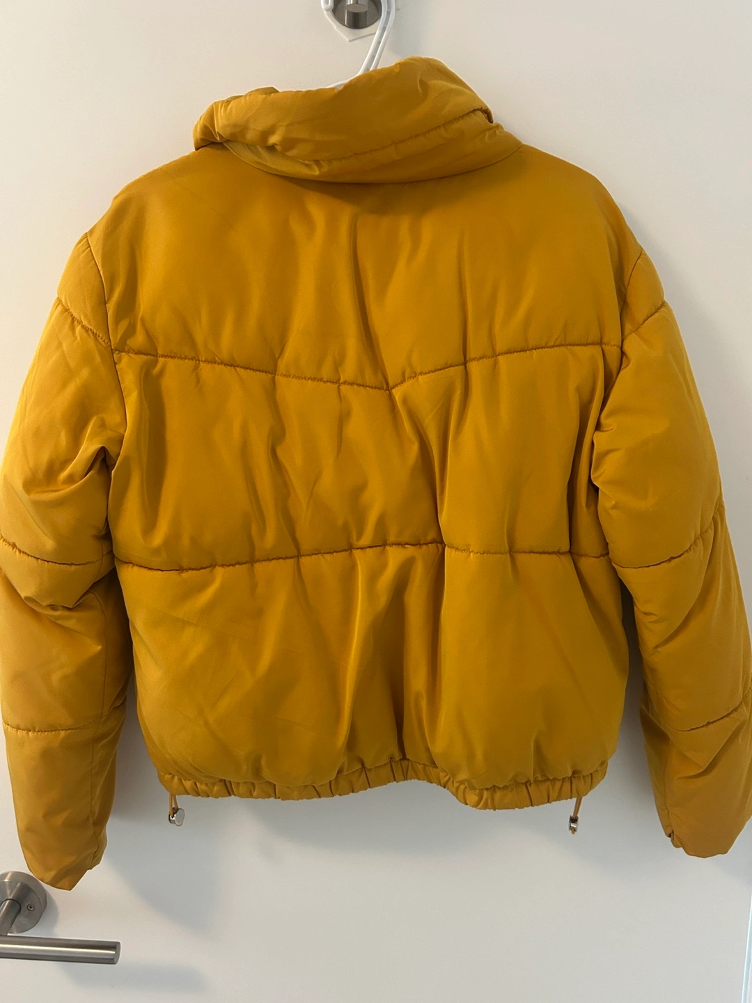 Women's mustard yellow puffer jacket. Size 36. Short, cropped style. Zip closure. Drawstring hem.