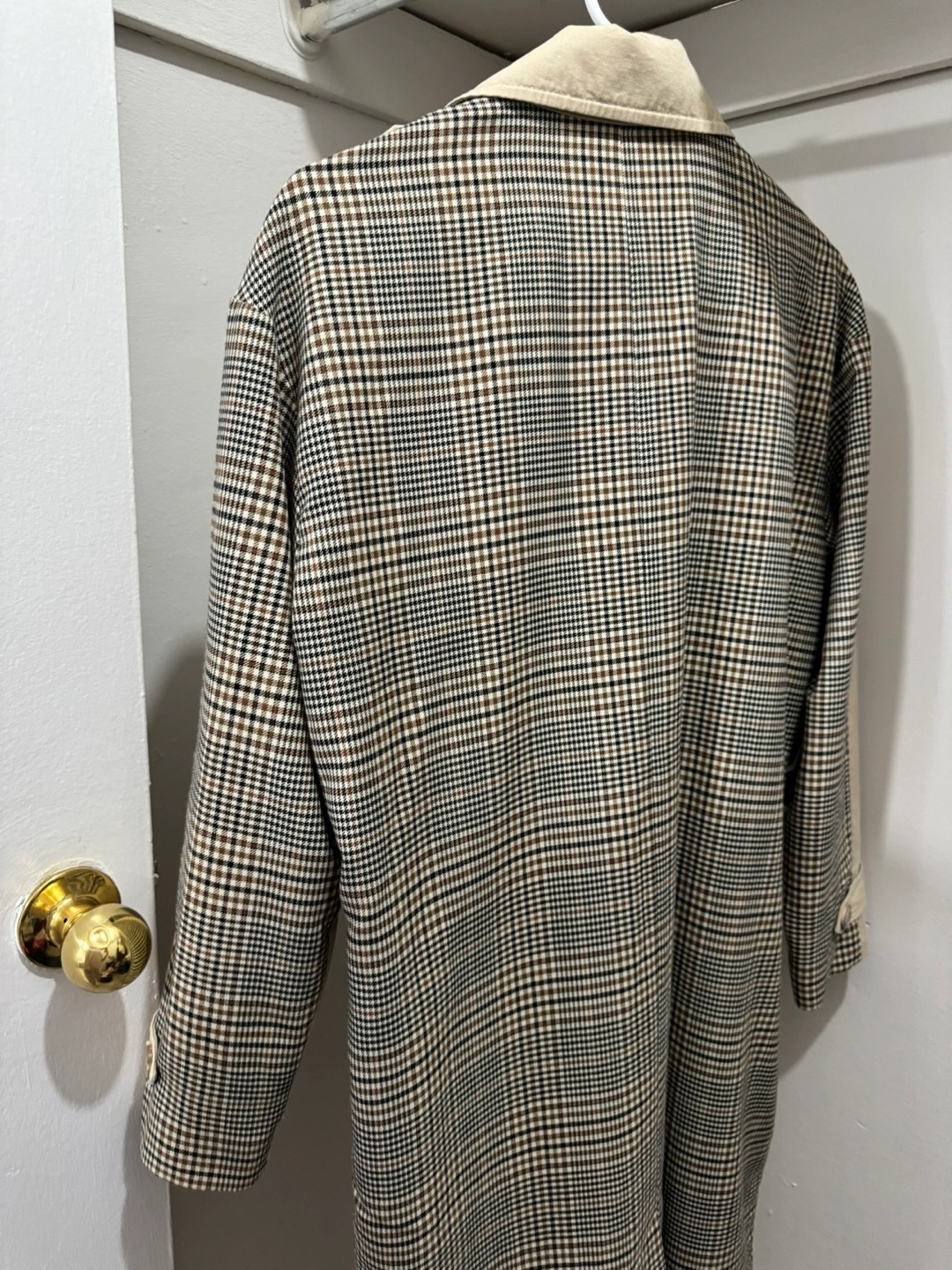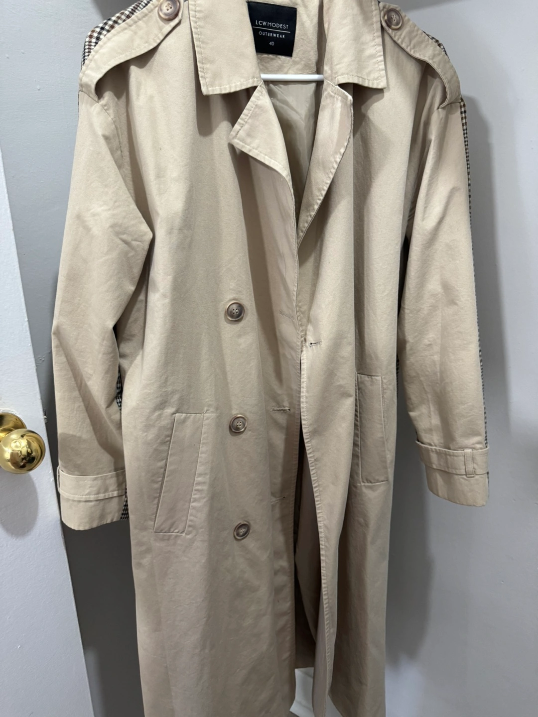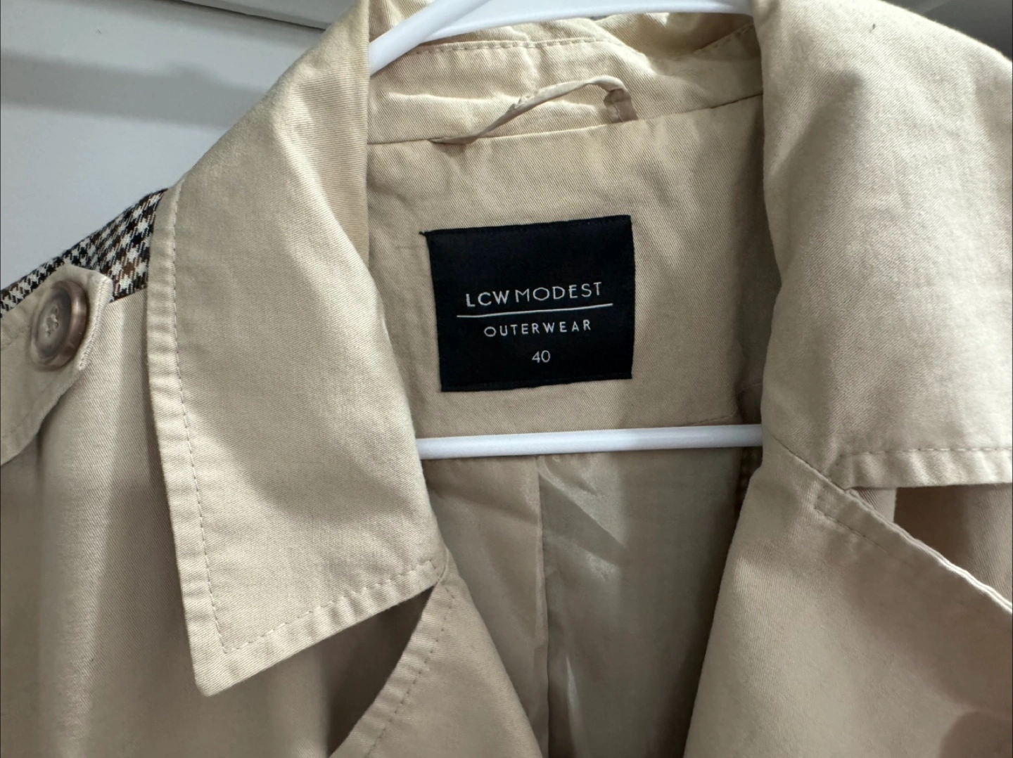 Selling a stylish LCW MODEST outerwear trench coat in size 40. It's in great condition and ready for a new home! The coat features a classic design with a double-breasted front and a timeless plaid pattern on the collar and sleeves.