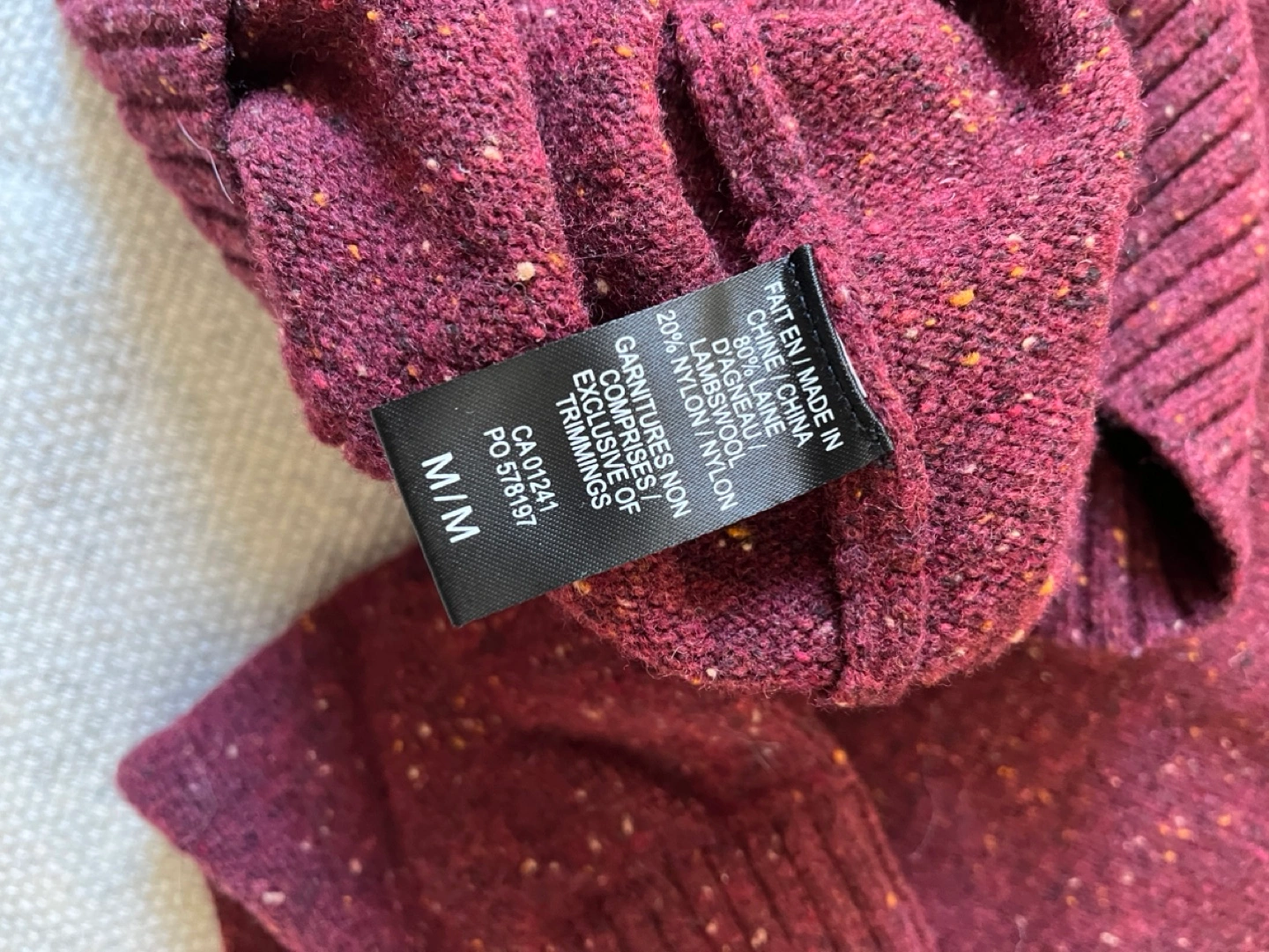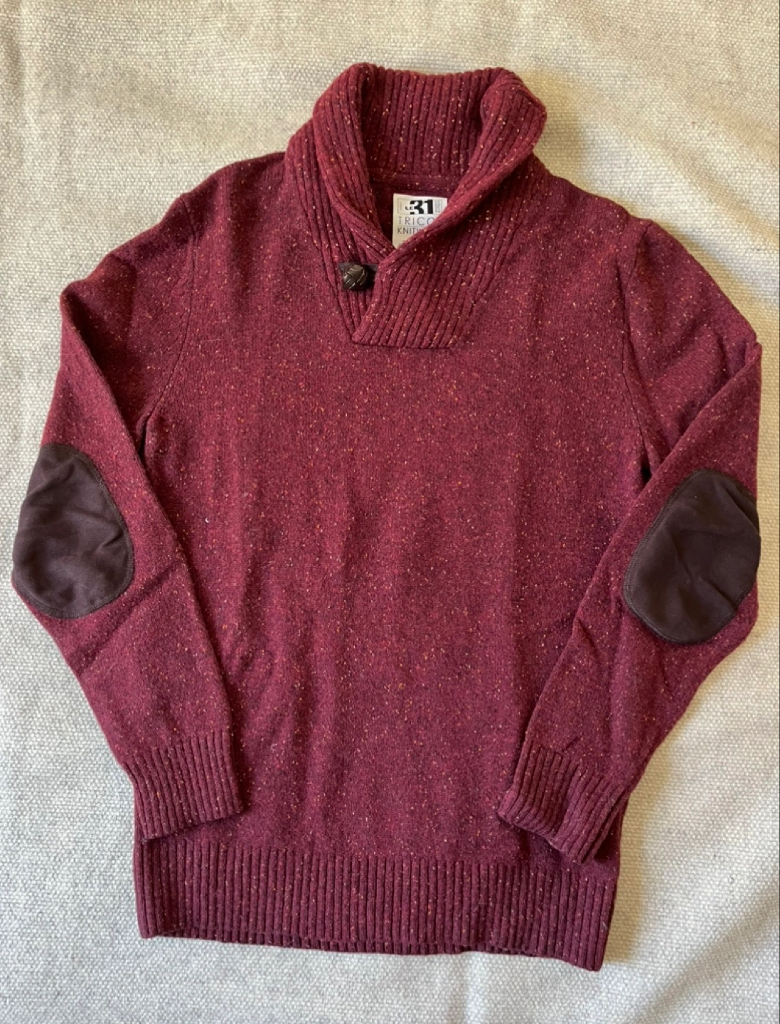 6380% Soft Lambswool sweater in burgundy with a speckled texture. Shawl collar with a button closure and elbow patches for added flair. Super comfy and warm for those coming chilly days