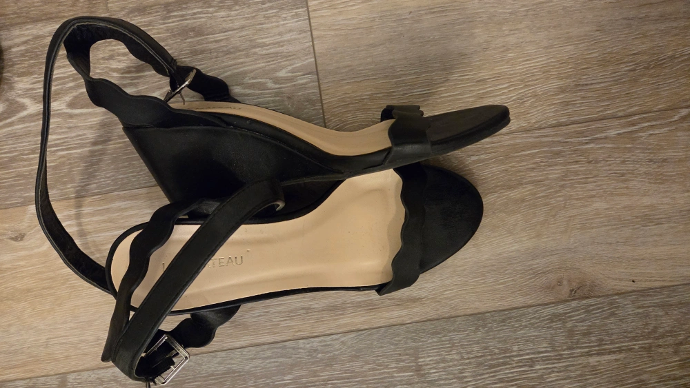 These are a pair of black wedge heel sandals from Le Chateau. They feature an ankle strap and a comfortable wedge heel. Perfect for dressing up or down! Available for pick up near Weston and Lawrence.