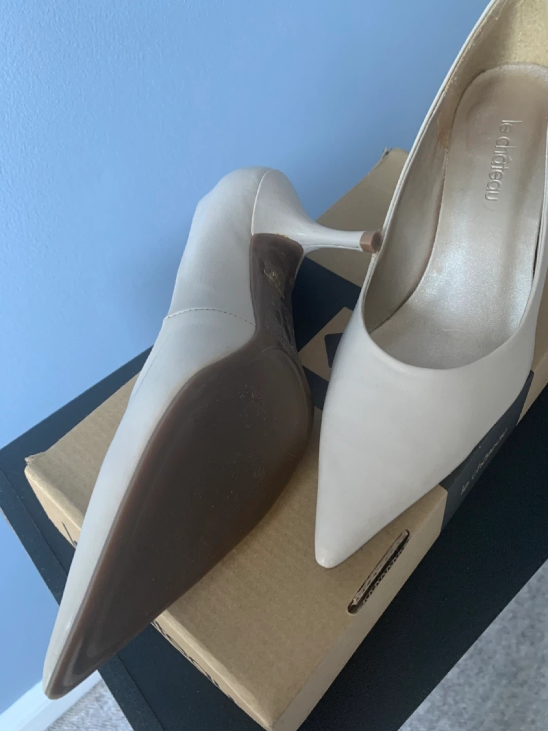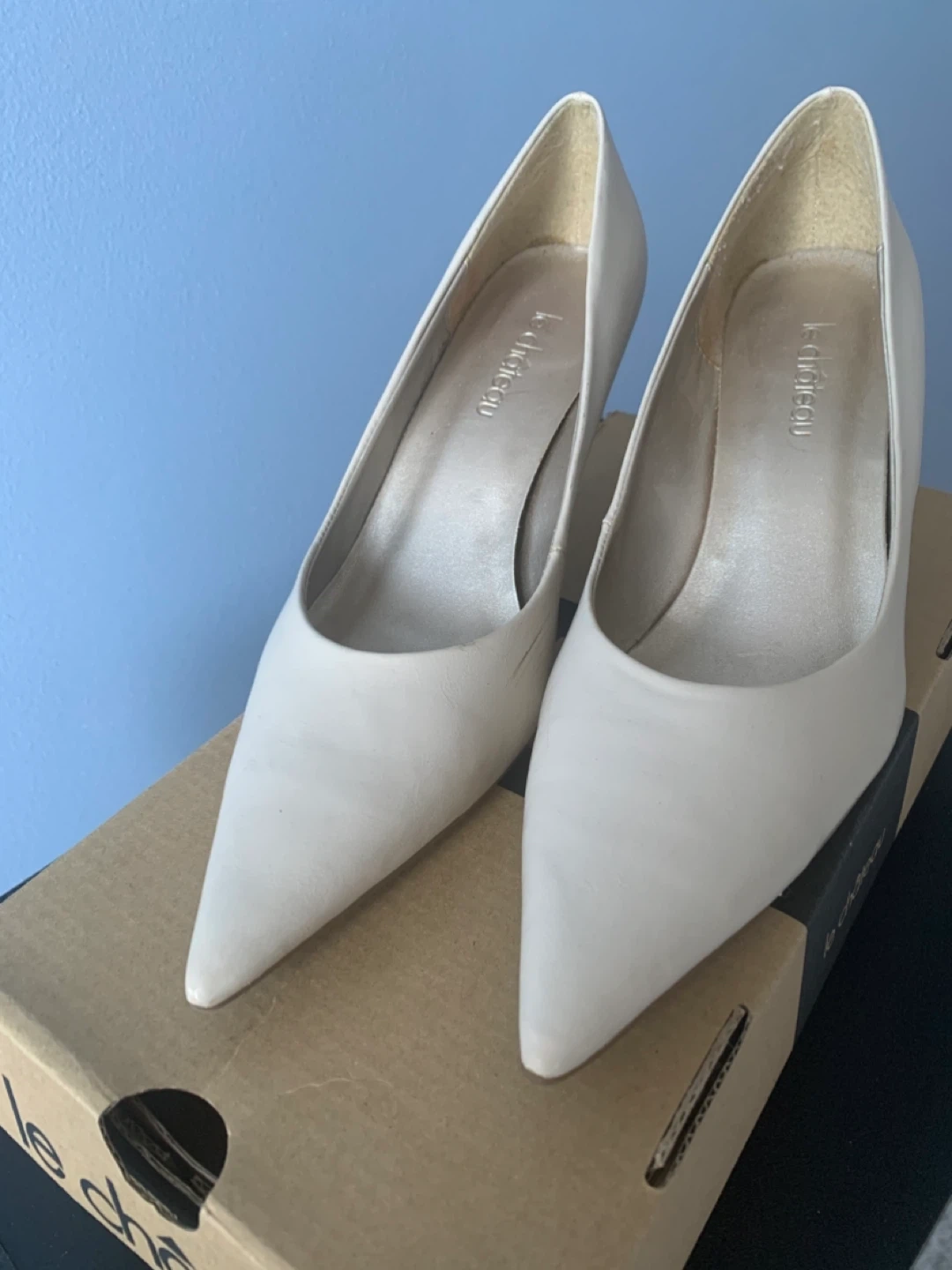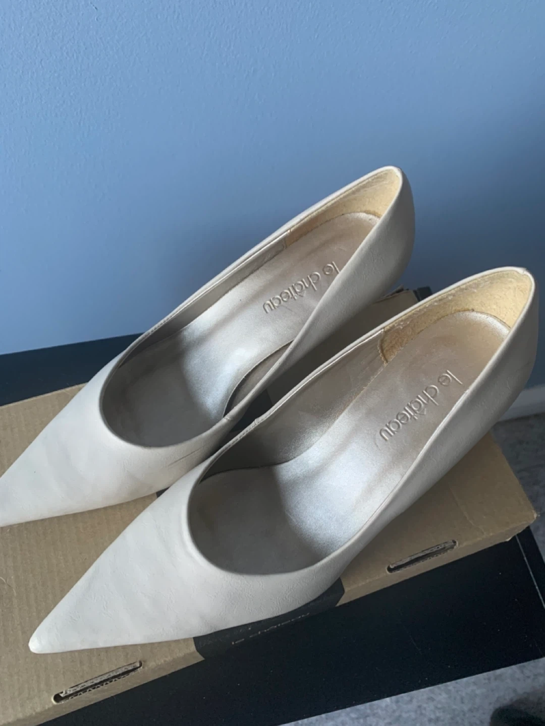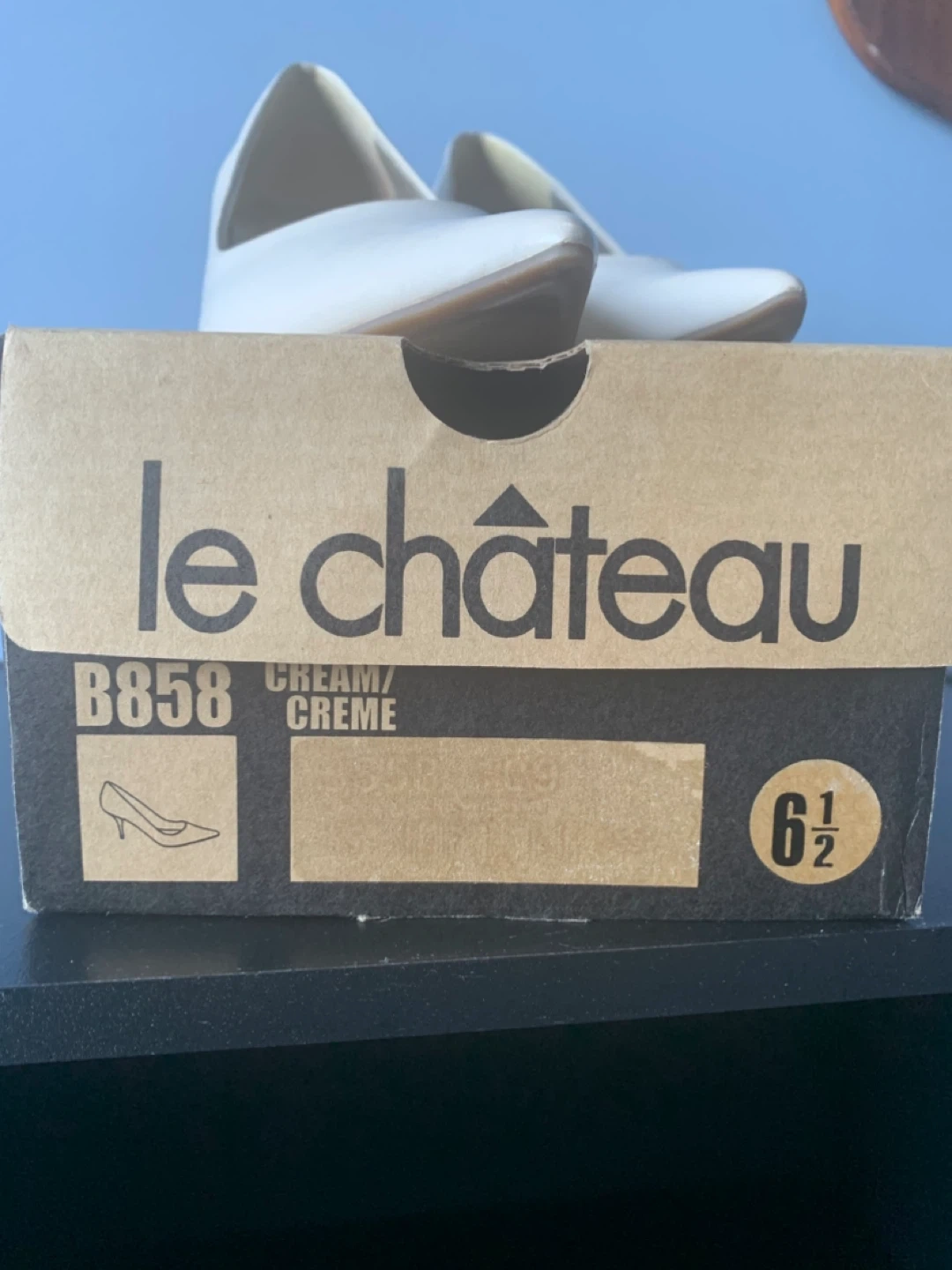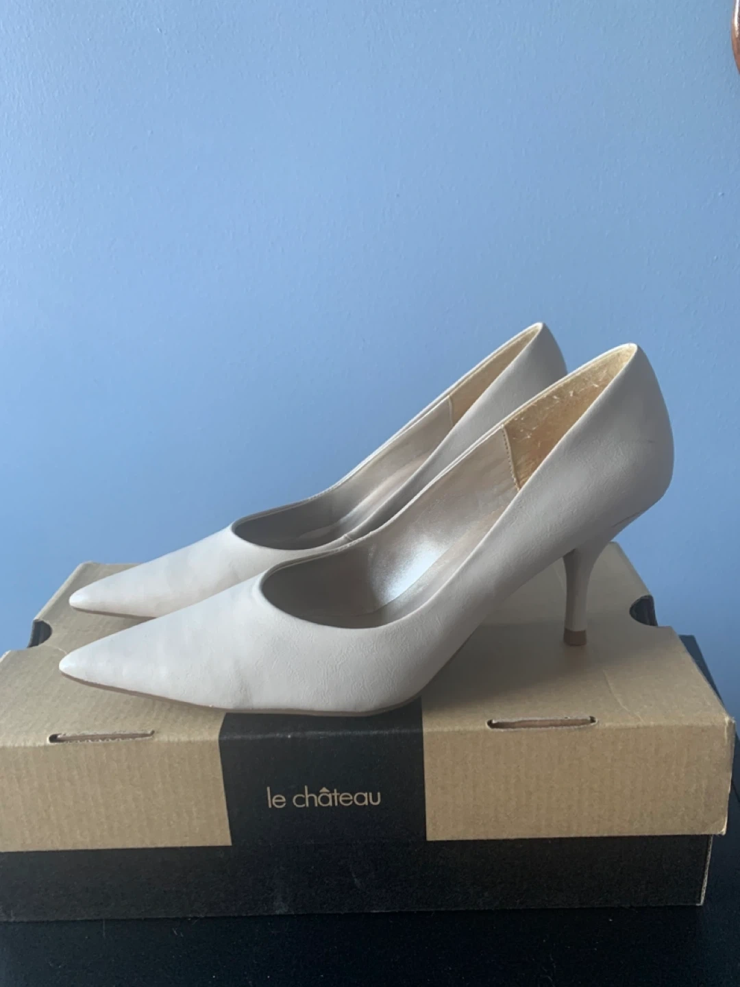 Le Chateau cream heels in size 6.5! They come with the original box. Perfect for dressing up or down, these heels are a versatile addition to any wardrobe. Gently used.