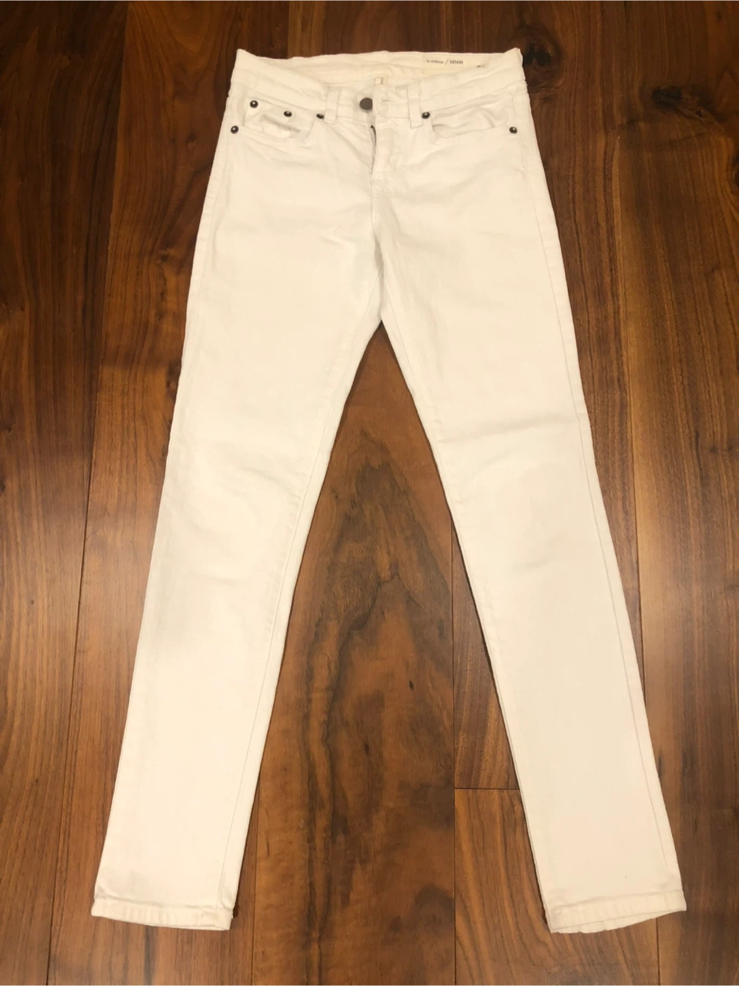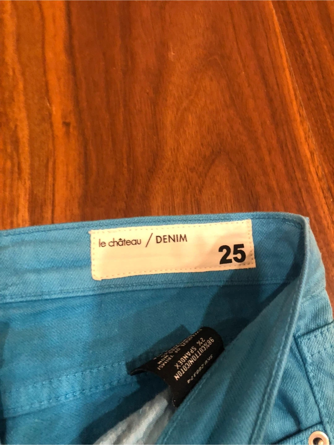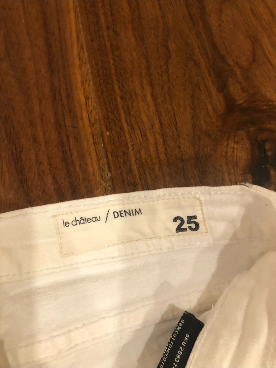 Selling a couple of pairs of Le Chateau denim jeans! One pair is white and the other is a nice teal colour. Both are size 25 and in great condition. They're made of 98% cotton and 2% spandex for a bit of stretch. Perfect for everyday wear! $10 each.