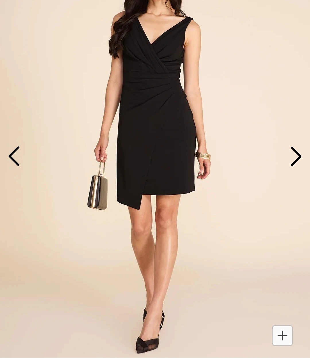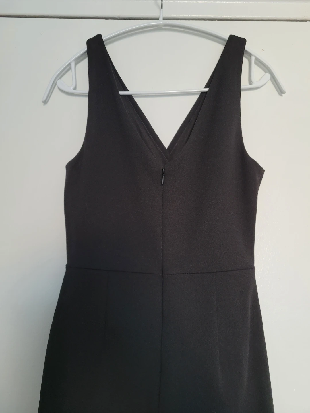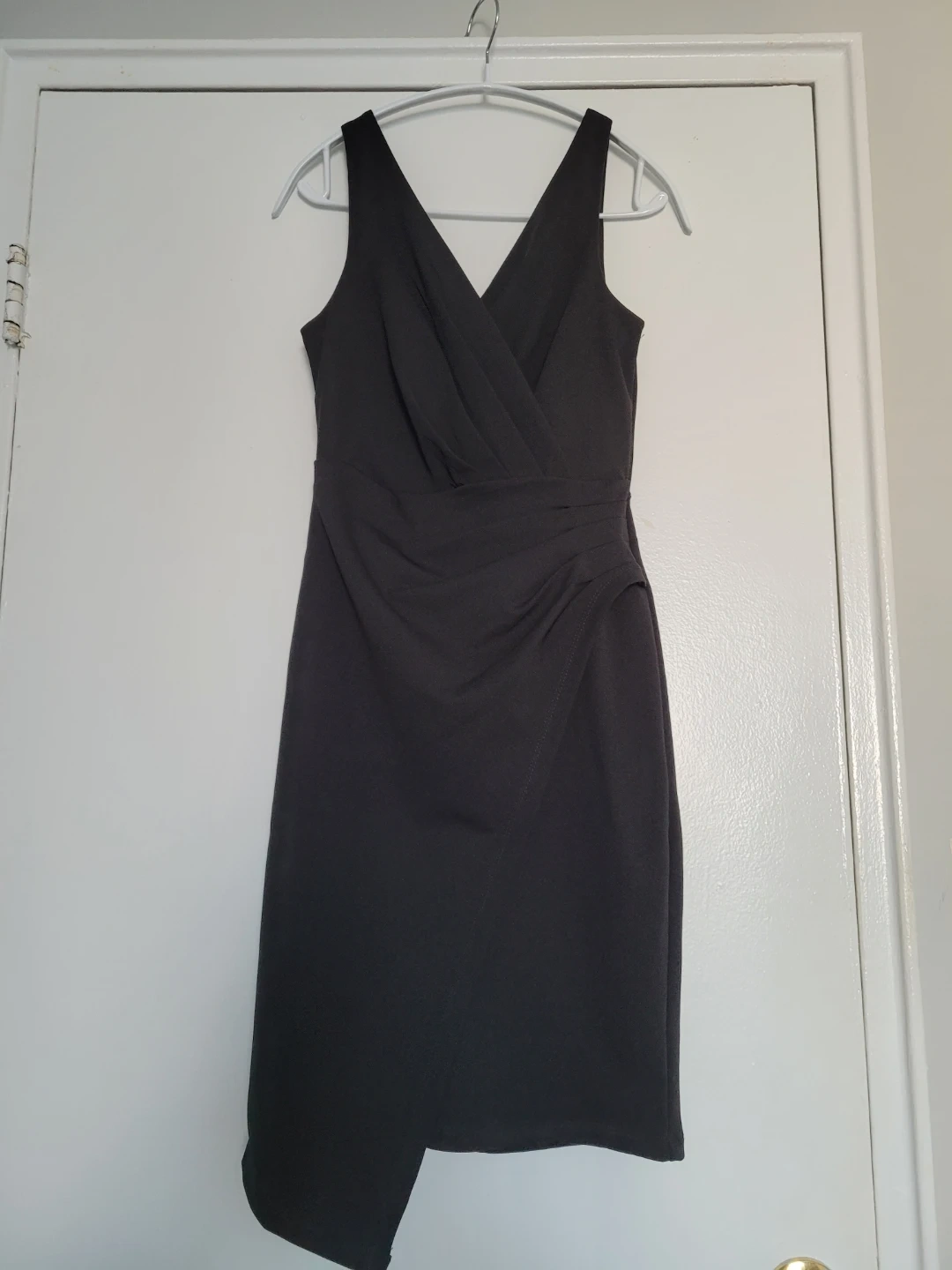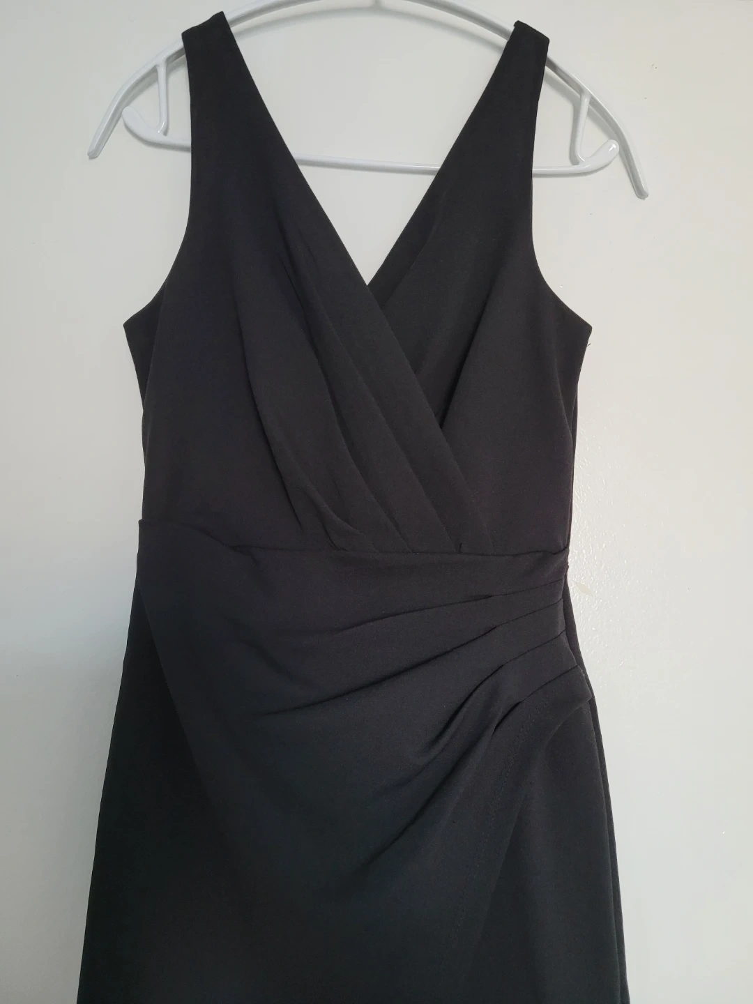 272Elegant black mini dress. Features a V-neckline, asymmetrical hem, and a form-fitting silhouette. Perfect for a night out or special occasion. Back zipper closure. Used once, HSP length: 36" Self fabric, generous stretch