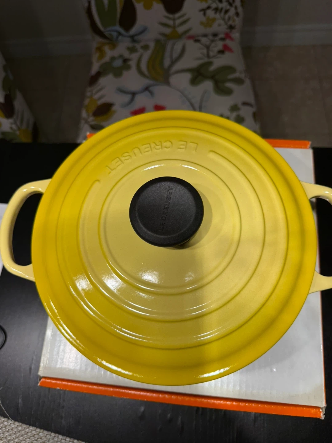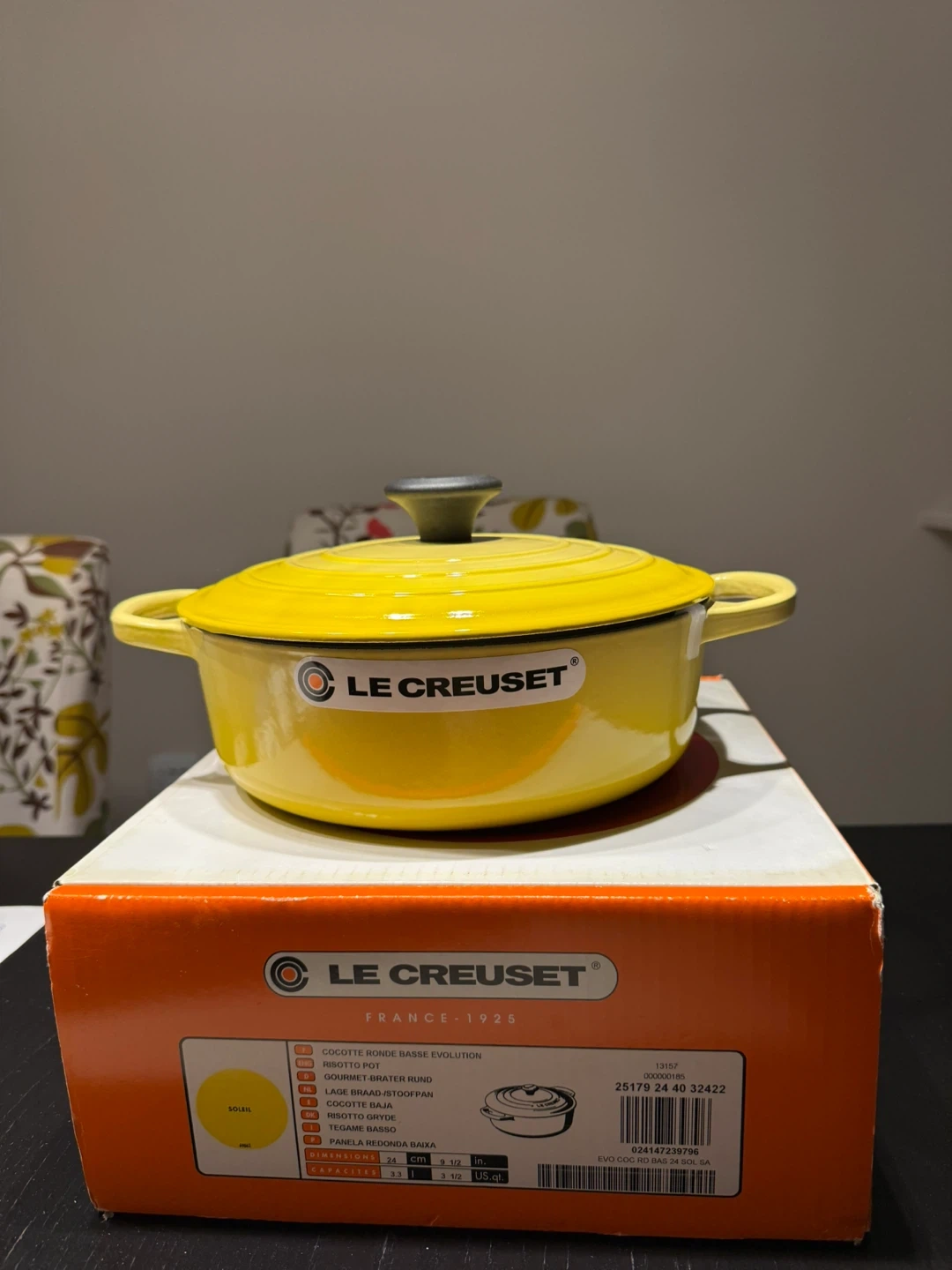 65Selling a Le Creuset Cocotte Ronde Evolution in the beautiful Soleil (yellow) colour! It's 24cm in size and comes with the original box. This is a versatile pot perfect for soups, stews, and more. The capacity is 3.3 US qt. It's in excellent condition and ready for a new home!