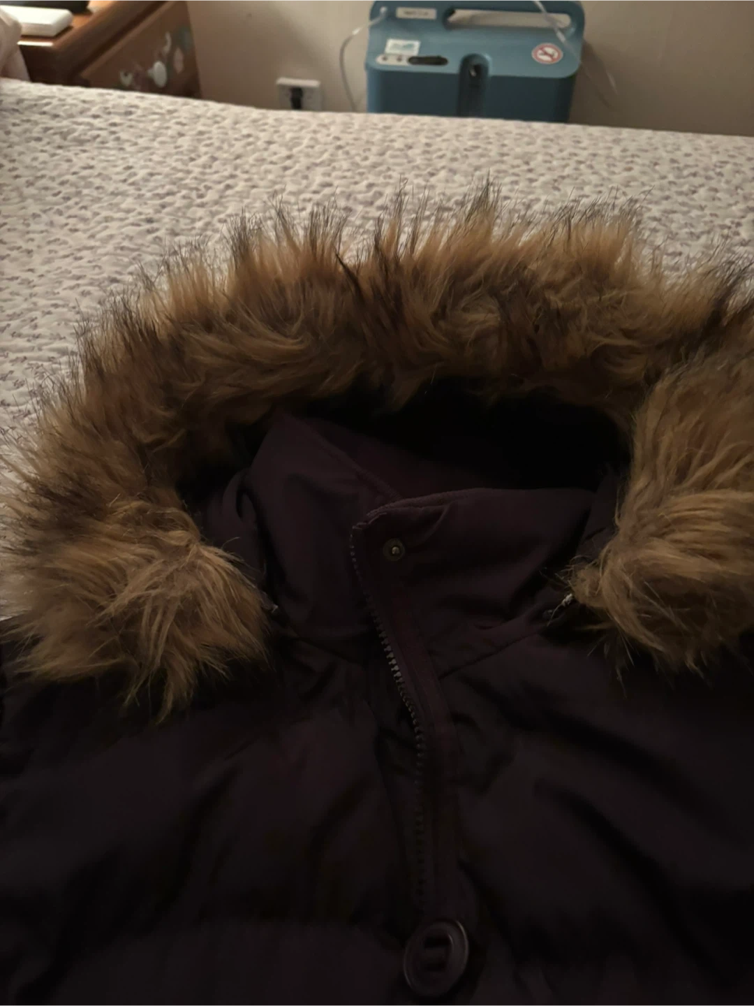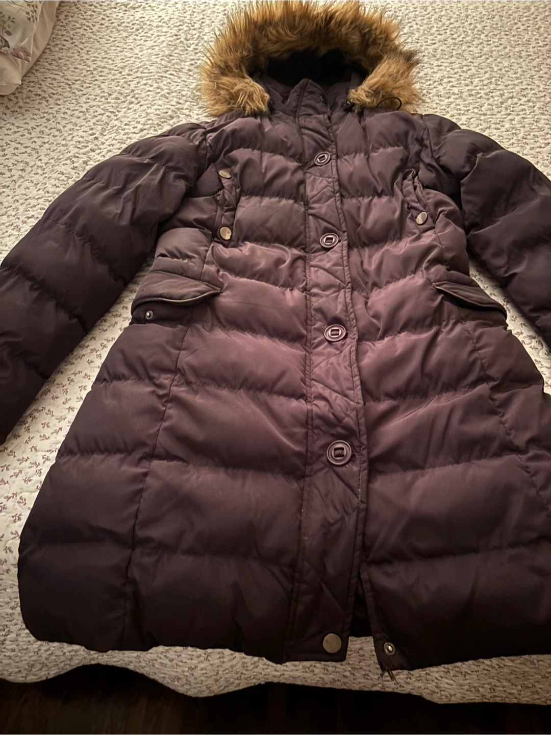 21I'm selling a gently used Leaf down-filled winter coat in size L. It's a stylish and warm option for the cold Canadian winters. It has a faux fur hood and plenty of pockets! 2 Pockets at the breast and 2 hand pockets. Plum in colour, Faux fur hood is removable. Very warm