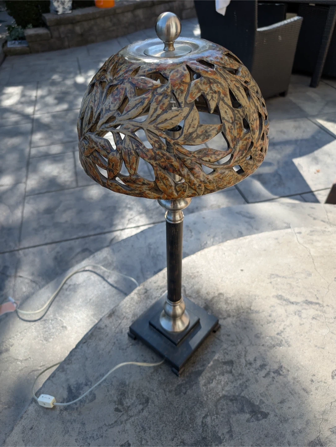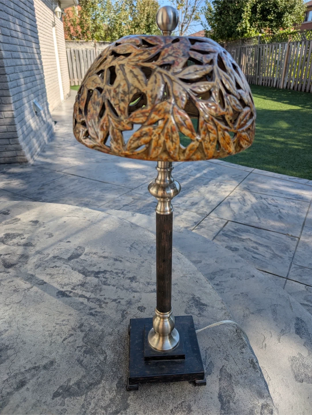 109This is a unique table lamp featuring a leaf pattern design. It has a metal frame and a dark base. It will add a touch of elegance to any room!
