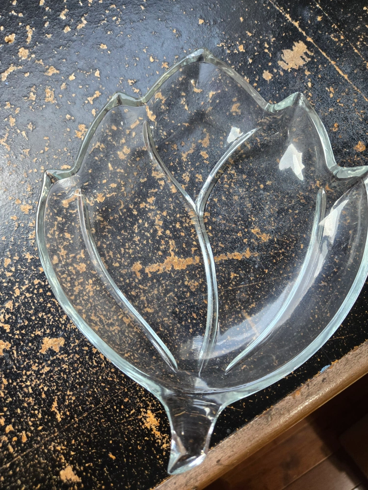 Selling a lovely leaf-shaped glass bowl. It's in great condition and perfect for serving snacks or as a decorative piece. It's clear glass, so it will match any decor!
