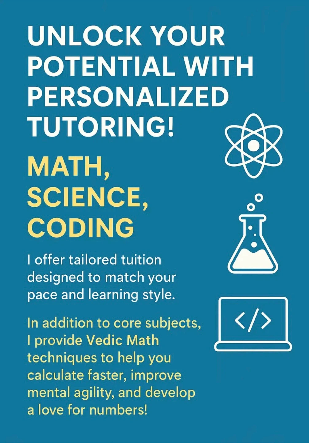 42Are you looking to excel in Math, Science, or Coding? Whether you’re aiming to strengthen your basics, I offer tailored tuition classes online(one-on-one) and, if required, in person as well. In addition to core subjects, I provide Vedic Math techniques to help calculate faster, improve mental agility! Coding enthusiasts are welcome too—I can guide you through programming fundamentals and practical problem-solving. Let's make learning enjoyable, efficient, and rewarding while also improving your grades! A little about myself: I hold a Bachelor of Science (BSc) in Mathematics, Chemistry, and Physics. and Master's in Bioinformatics