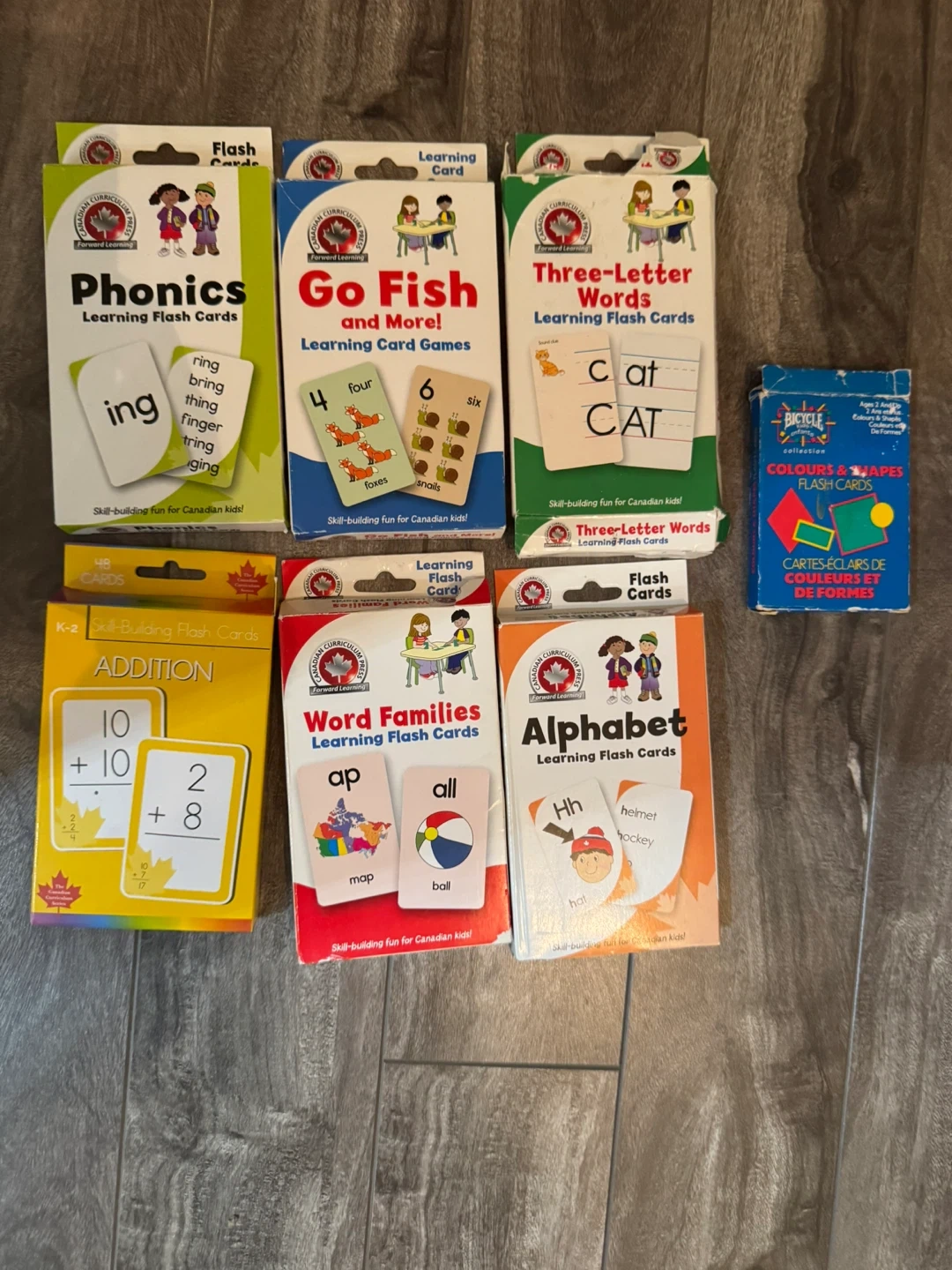 10Selling a bundle of learning flash cards for kids! Includes phonics, go fish, three-letter words, addition, word families, alphabet, and colours & shapes flash cards. Great for skill-building and fun learning!